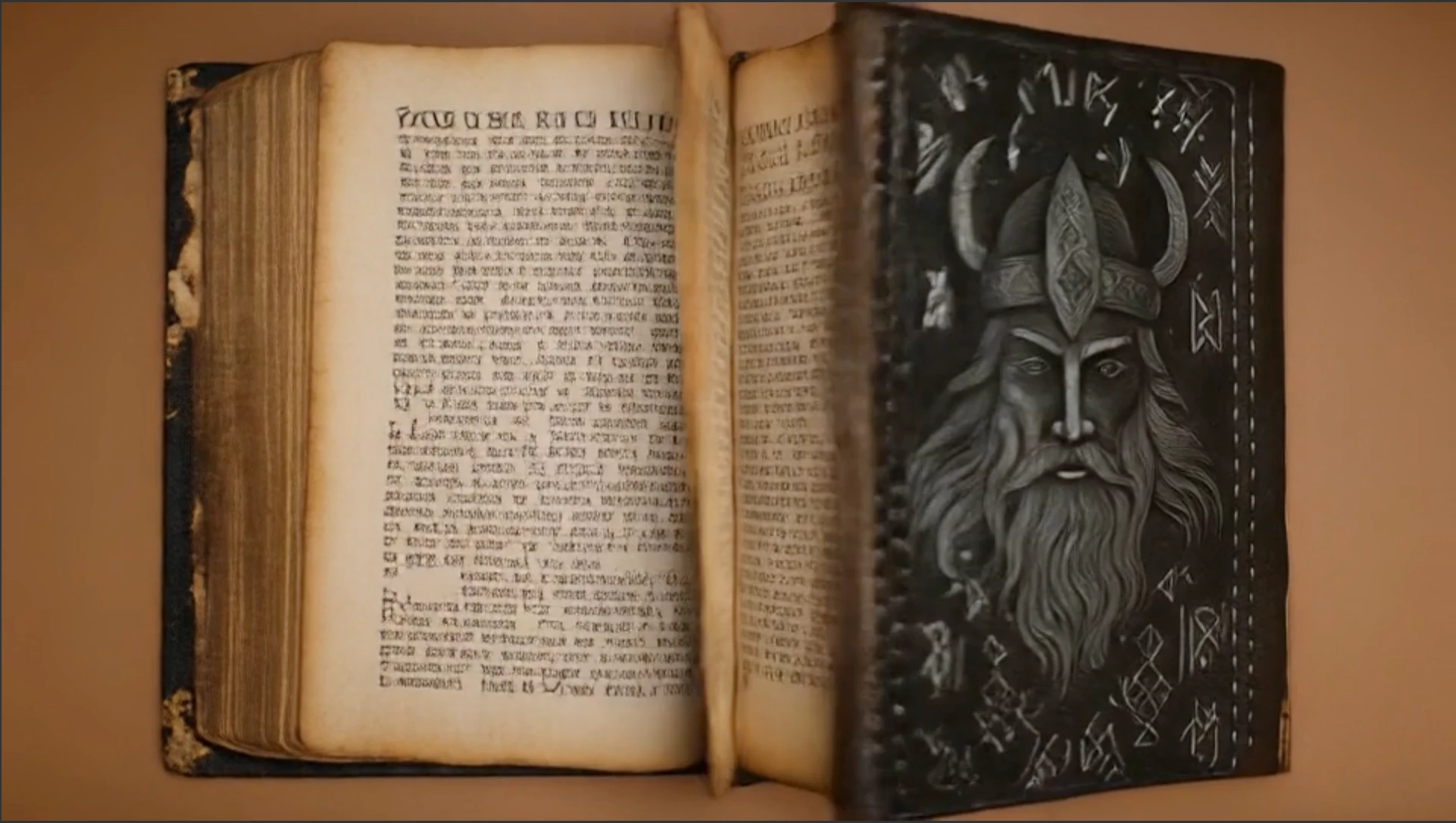 I created the image of a book with a viking face on it (first image). I prompted inside the image to video generator "The cover opens to a page in the middle of the book. The page is very ancient and appears weathered and discolored, the page inside the book that we wee is filled with text in the style of viking runes."