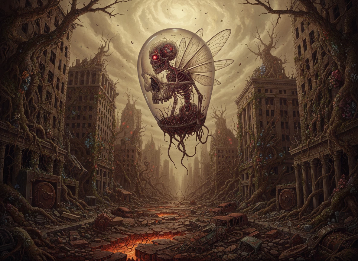 "An ultra-detailed, hyper-realistic, surreal, and ultra-dramatic masterpiece, profoundly unsettling. A lone, emaciated human figure, encased in a translucent, primitive skull-shaped capsule, drifts in a choking, sickly yellow fog. Below, the colossal skeletons of skyscrapers, once symbols of financial power, are now grotesque, gnarled monuments, completely engulfed by invasive, alien flora. Every crumbling shard of concrete, every twisted rebar, every thorny vine is rendered with obsessive attention to detail. The atmosphere is thick with tiny particles, representing dust, ash, and toxic droplets from a weeping sky: the deep browns of decay, the vibrant reds of mutated vegetation, and the ubiquitous, sickly yellows of the atmosphere. Every surface, every texture, every shadow contributes to the overwhelming impression of meticulous ruins."