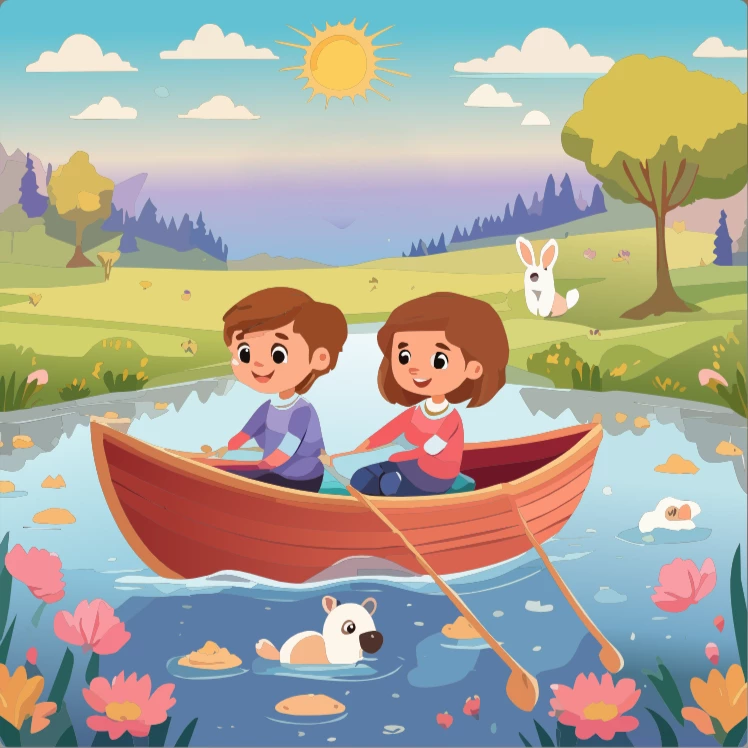 The prompt I used: vector artwork of two children sailing in a tiny boat across a sparkling river, with friendly animals watching from the shore. Playful, cartoon-like style.