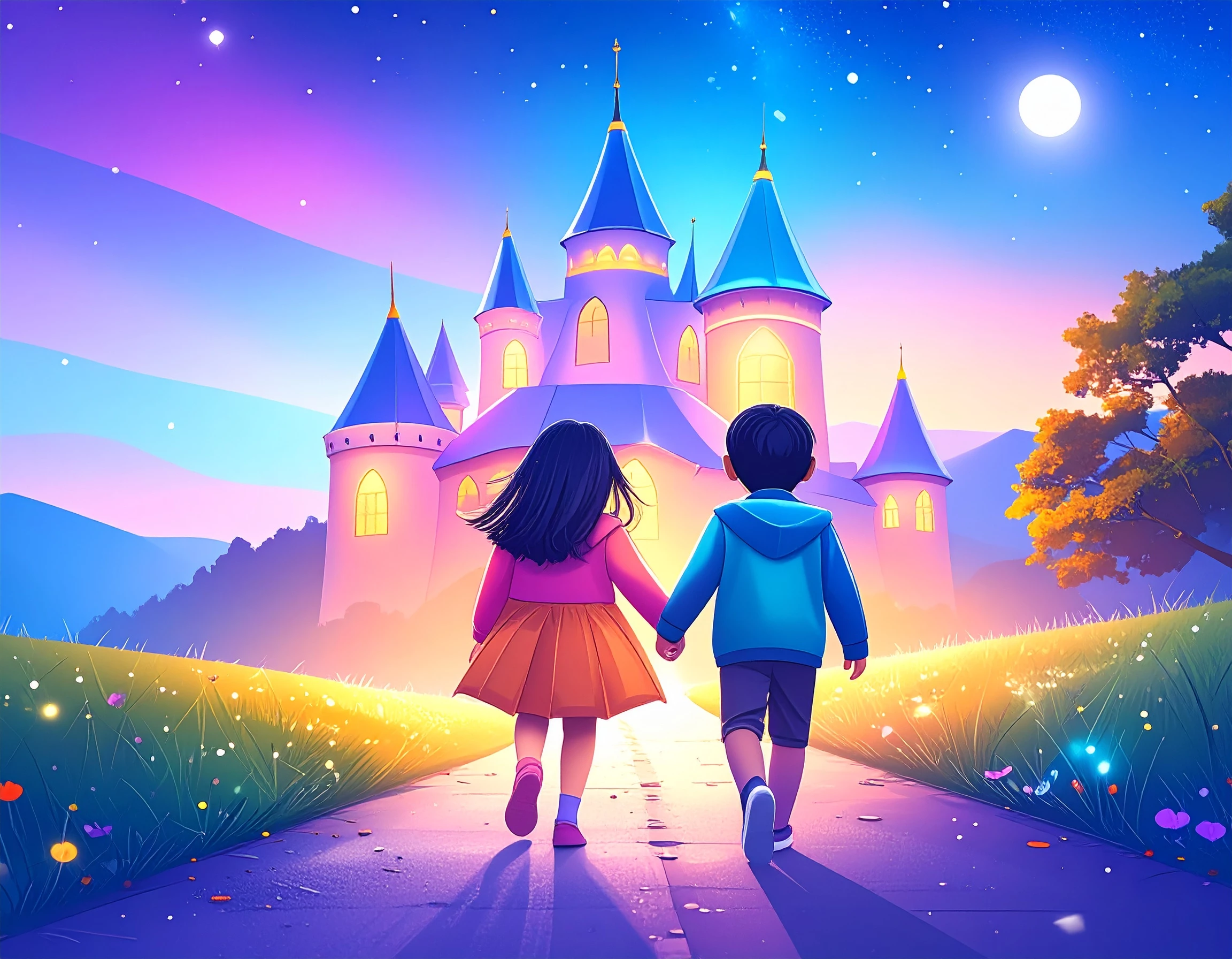 Create a vector illustration inspired by children’s stories, think magical castles, talking animals, tiny adventurers, or whimsical forests.