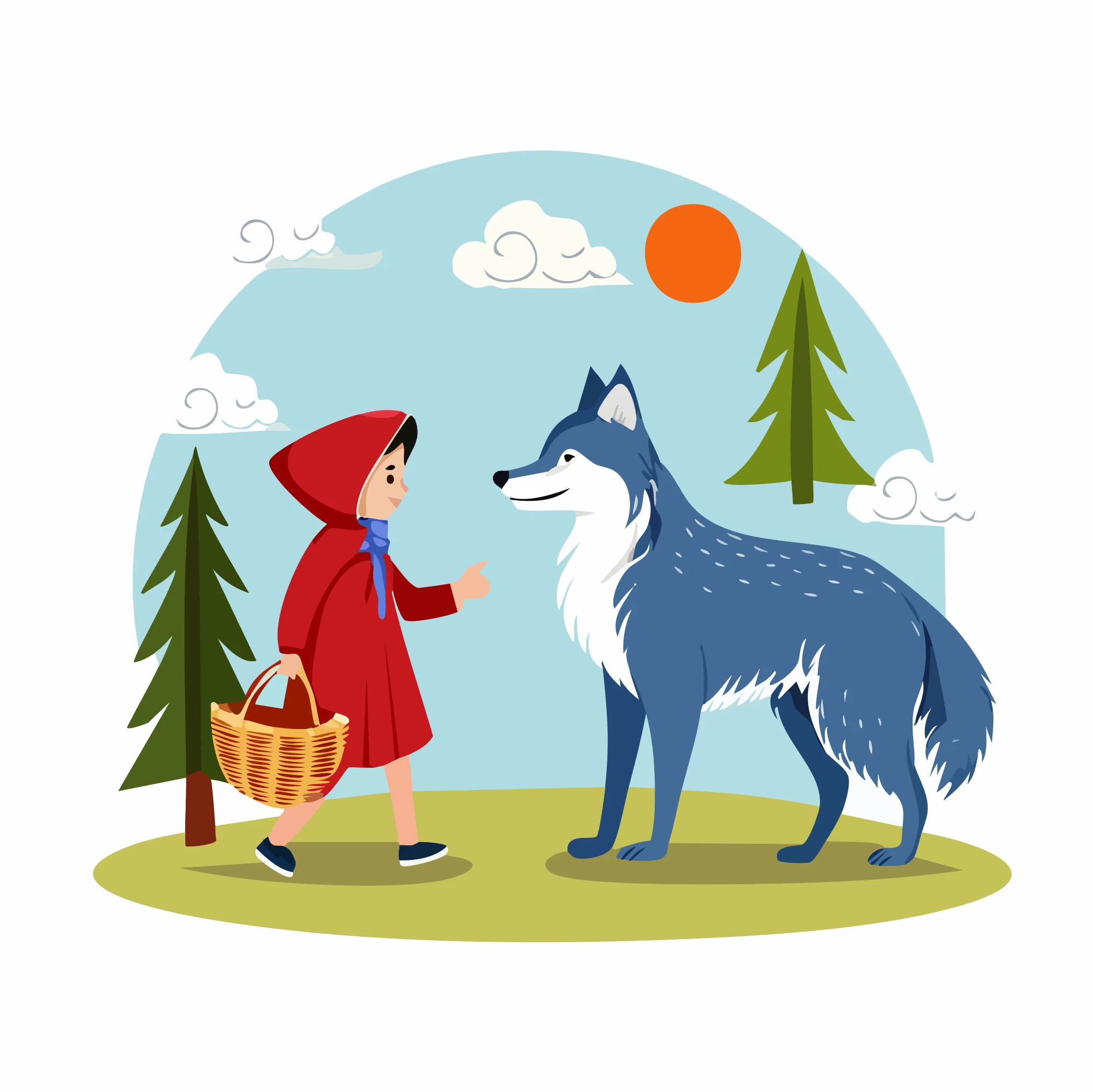 prompt:As a girl in a red hood walks through the forest carrying a basket, a big wolf comes out and talks to the girl.
