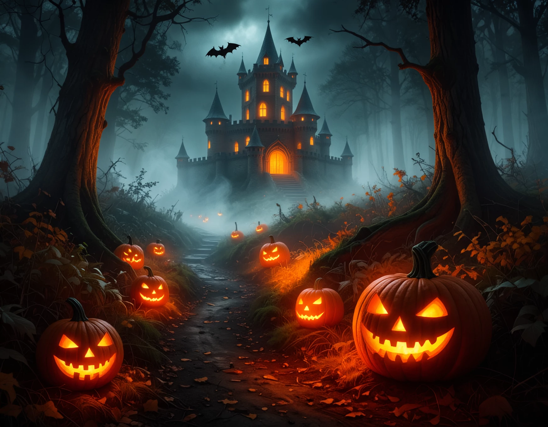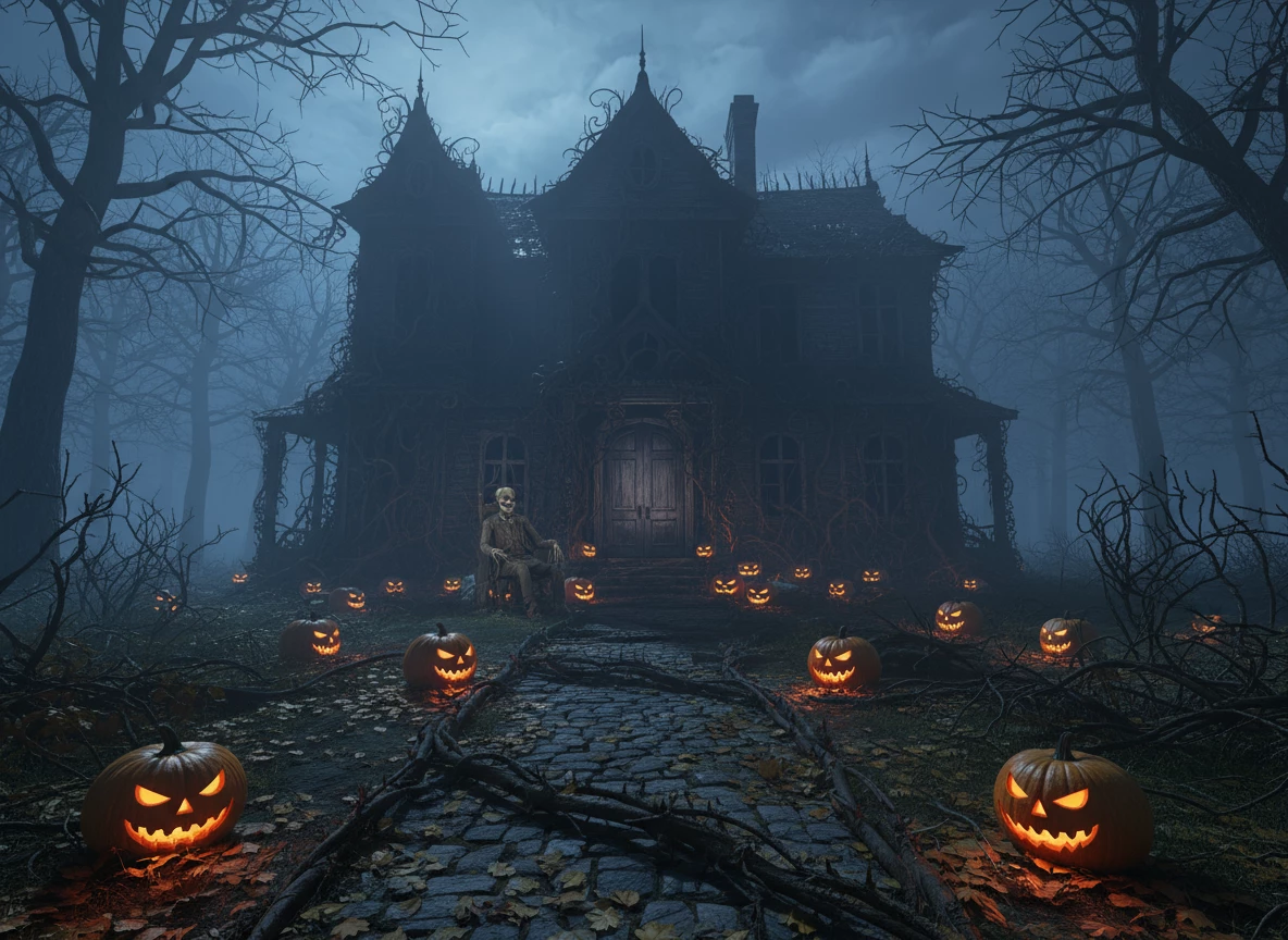 Prompt: A dark, spooky haunted house deep in a forest at night. A narrow vineyard walkway leads up to the house, covered in twisted vines. Scattered all around the ground are glowing orange pumpkins, some nestled among fallen leaves. Next to the main door, a skeleton sits on an old wooden chair, grinning eerily. The scene is misty and moonlit, with gnarled trees, long shadows, and a chilling Halloween atmosphere