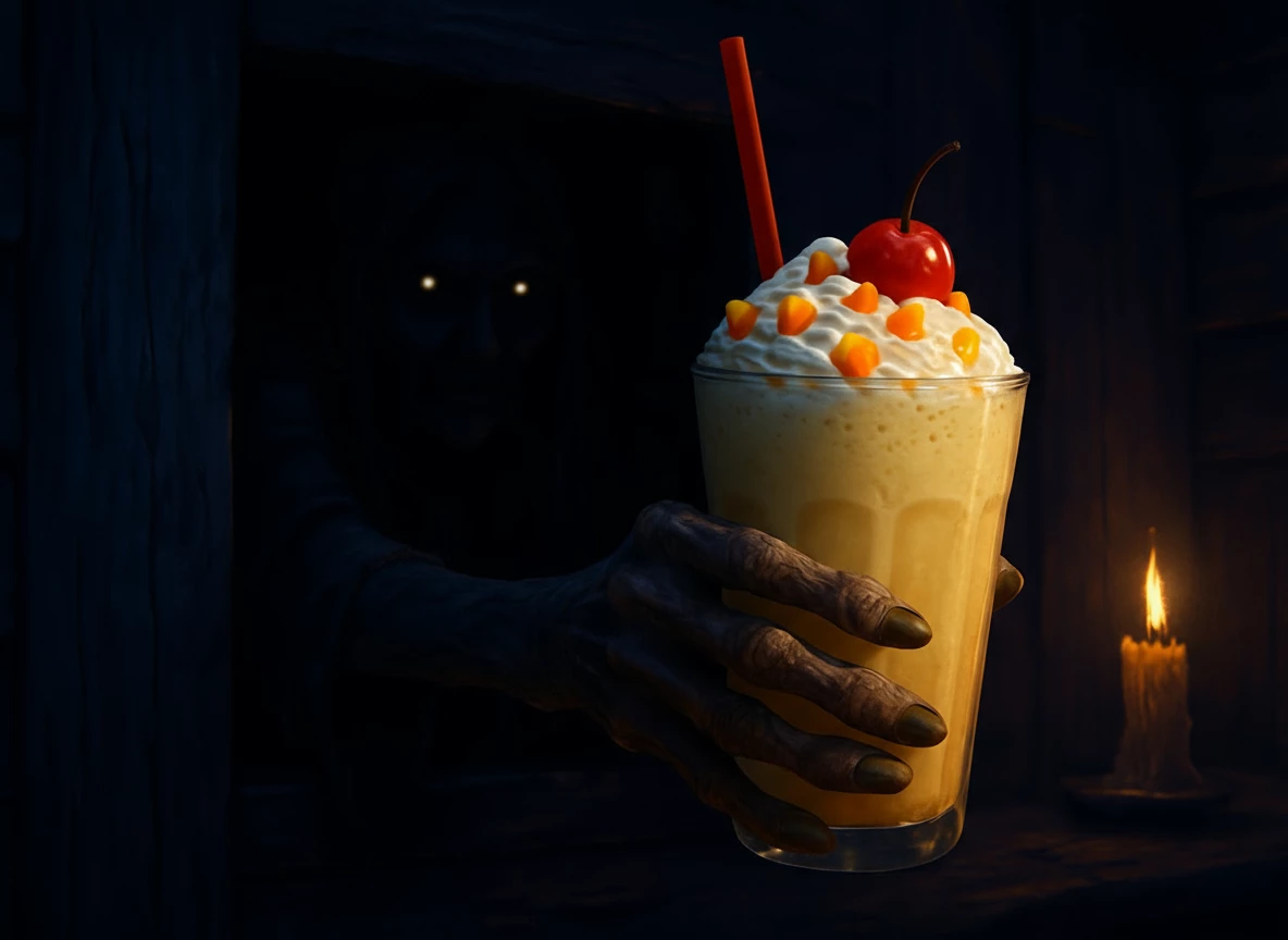 Prompt: Inside a spooky dilapidated shack that is dimly lit by candle light there is a dark gap in the wall that a mysterious, bony arm of a withering old woman is sticking straight out of and in the hand coming toward the camera is a perfect glass milkshake with a big red straw. You can barely see her outline but you can see the reflection of the candlelight in her eyes making them appear as if they are glowing. The milkshake is egg nogg and candy corn and is the only appealing thing in the scene. There is whipped cream and bits of candy corn with a very saturated and vibrant red cherry without a stem. There is contrast within from the rest of the spooky, grim scene and the breathtakingly appetizing milkshake.. The whole vibe of the scene is horror, spooky, dark blues and dark purples all dimly lit, except the milkshake.