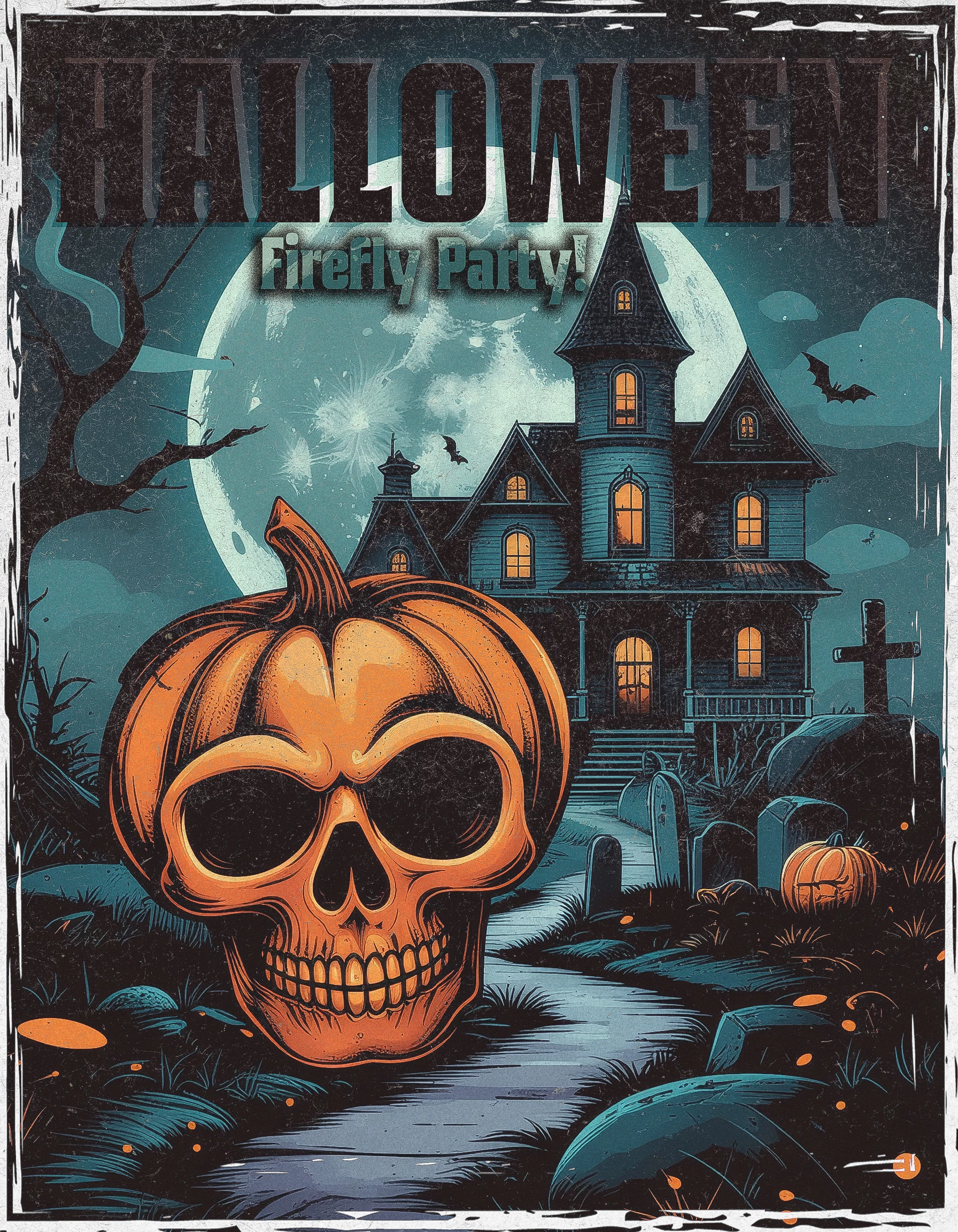 A detailed Halloween illustration of an orange human skull blended with a pumpkin shape in the foreground, glowing slightly from within. In the background, a sinister Victorian haunted house with pointed roofs and arched windows stands under a large glowing full moon. The scene includes gravestones, a large twisted dead tree, swirling mist, and flying bats. The atmosphere is eerie and cinematic, lit by moonlight with teal-blue and orange tones, strong contrast, and textured shadows. The style should look like a vintage horror poster, highly detailed, gritty, and illustrated with painterly lighting and depth, similar to classic Halloween party posters.