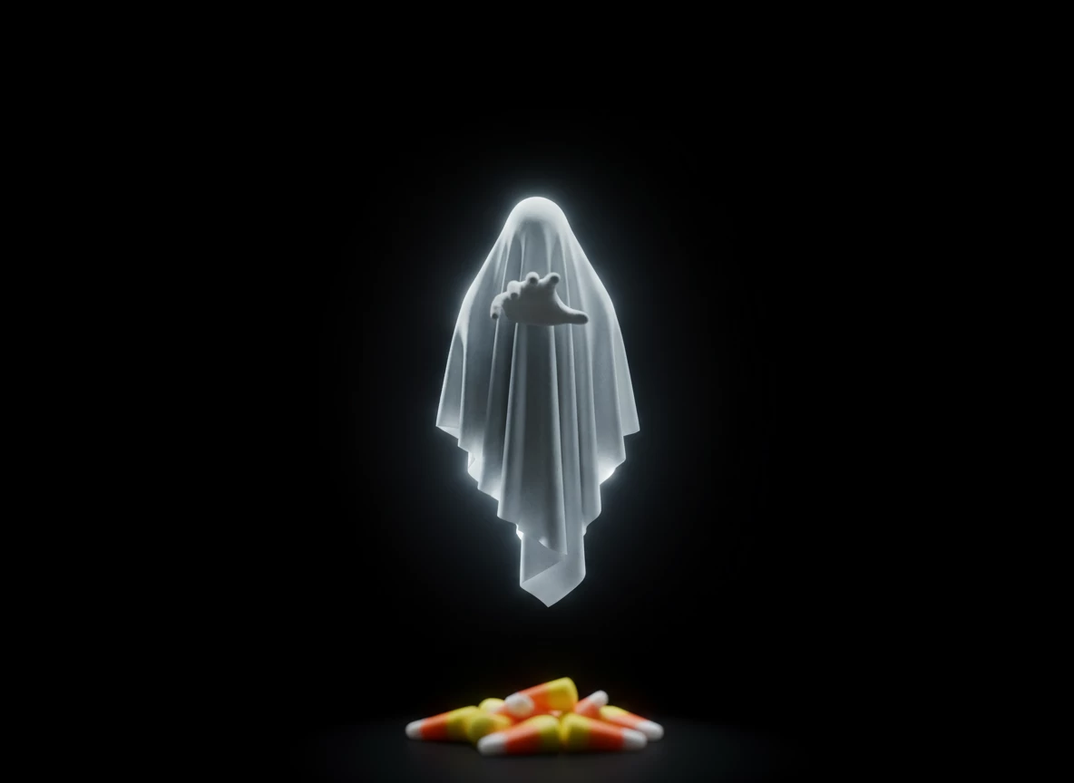 Prompt: "A minimalistic ghost draped in a white sheet, softly glowing against a dark, empty background, extending one arm toward the front of the frame, holding bright candy corns."