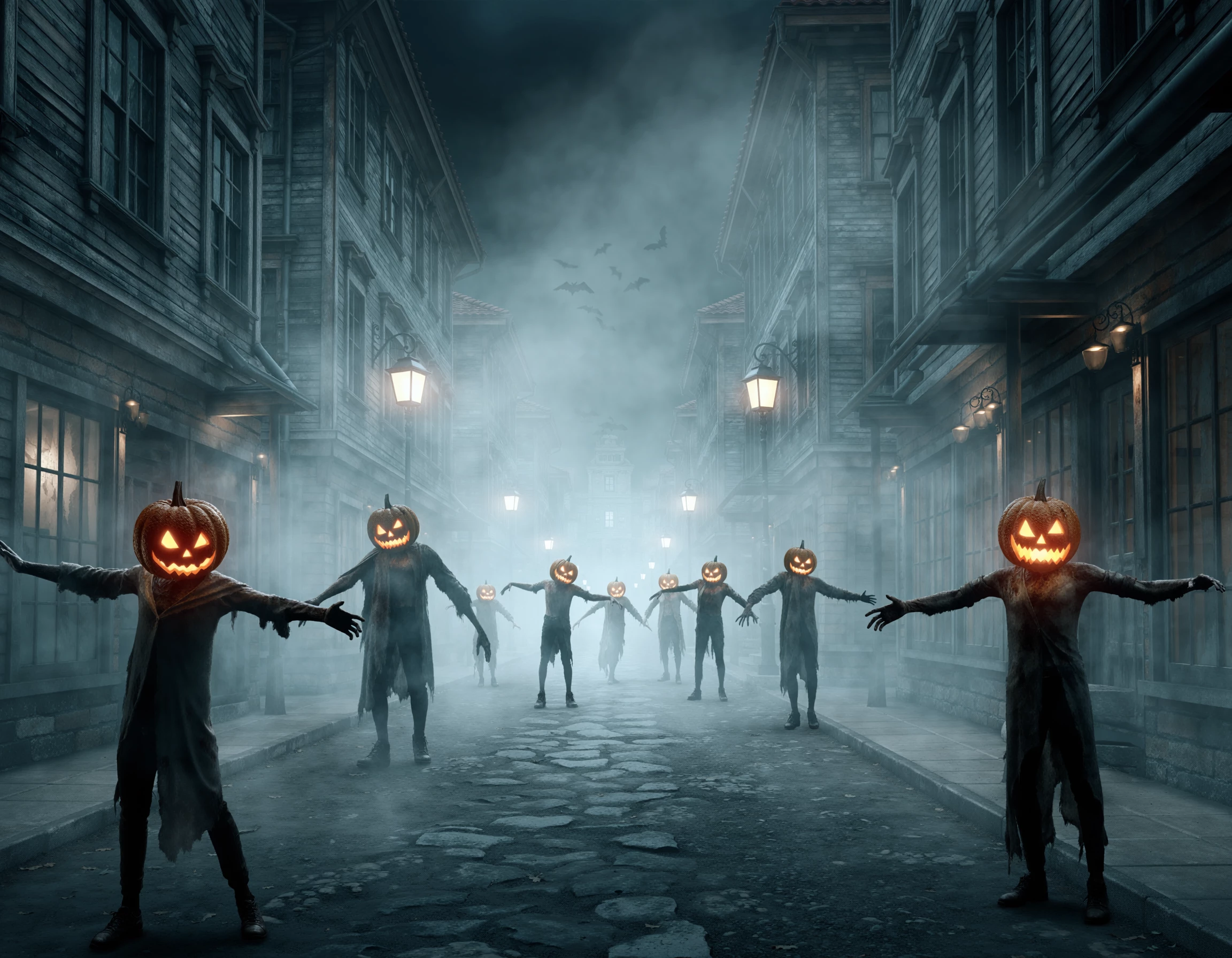 Prompt: A large group of zombie like figures with arms outstretched with carved pumpkins for heads in a dark misty street of old Wooden houses (Firefly 5)