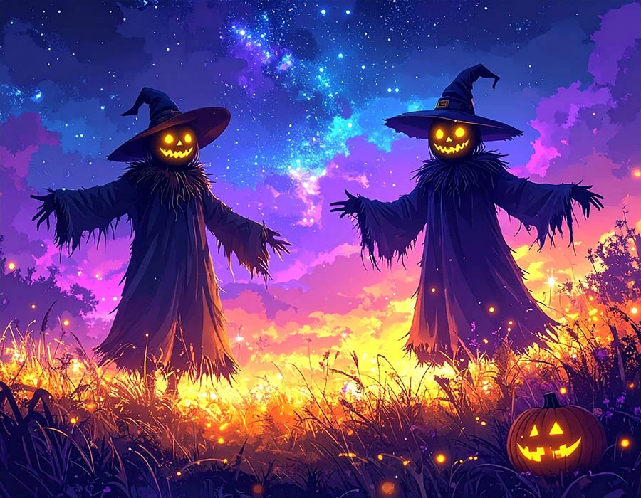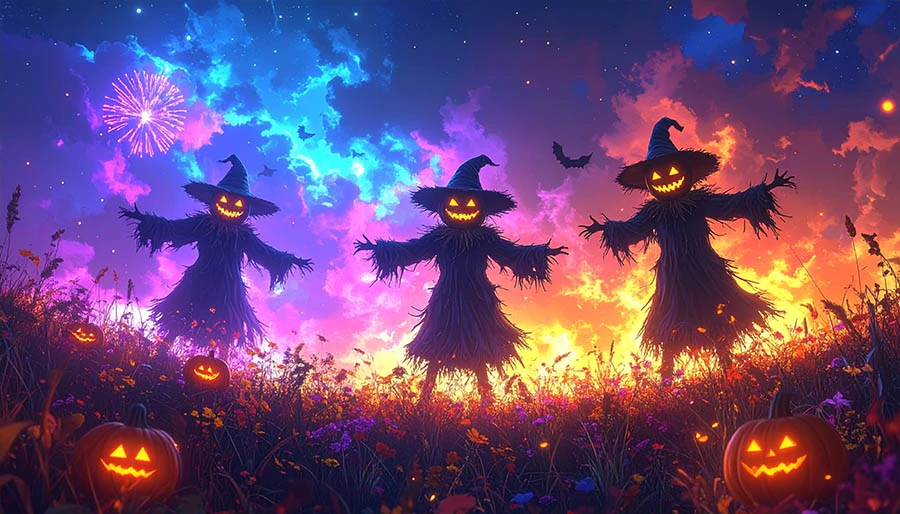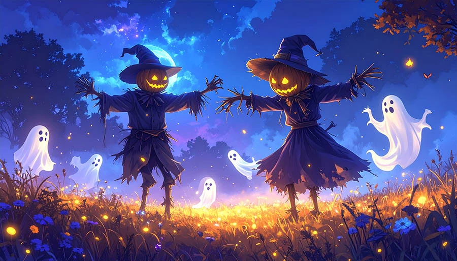 scarecrows waltz with ghosts at night amid drifting mist and fireflies. colourful, bright, vibrant