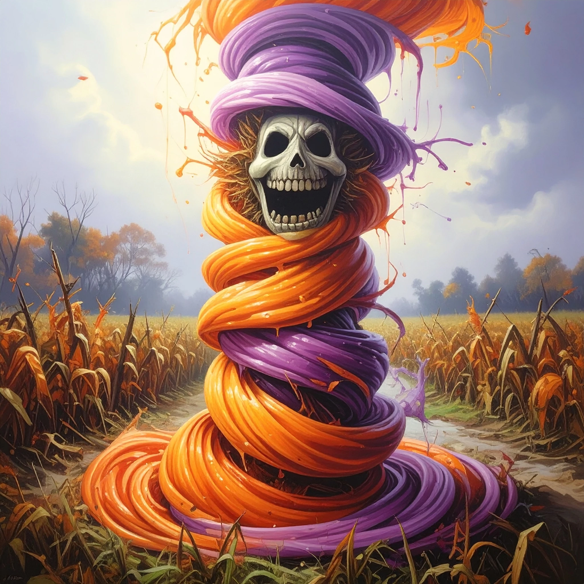 Prompt: A painting of a surreal tornado made of vibrant, swirling candy in neon-orange and purple hues, spinning around a laughing scarecrow. The candy twists and turns with dynamic motion blur, creating a whimsical and otherworldly scene. The background features a rustic, autumnal landscape with misty fields and skeletal trees, adding to the fantastical atmosphere. The lighting is soft and radiant, casting a gentle glow that enhances the surreal beauty of the candy tornado. The overall design captures a dreamlike, fantasy-realism style, blending the magical and the macabre in a captivating visual experience.