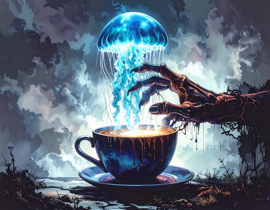 creepy hand reaching for a cup of coffee, w transparent glowing ghostly jellyfish