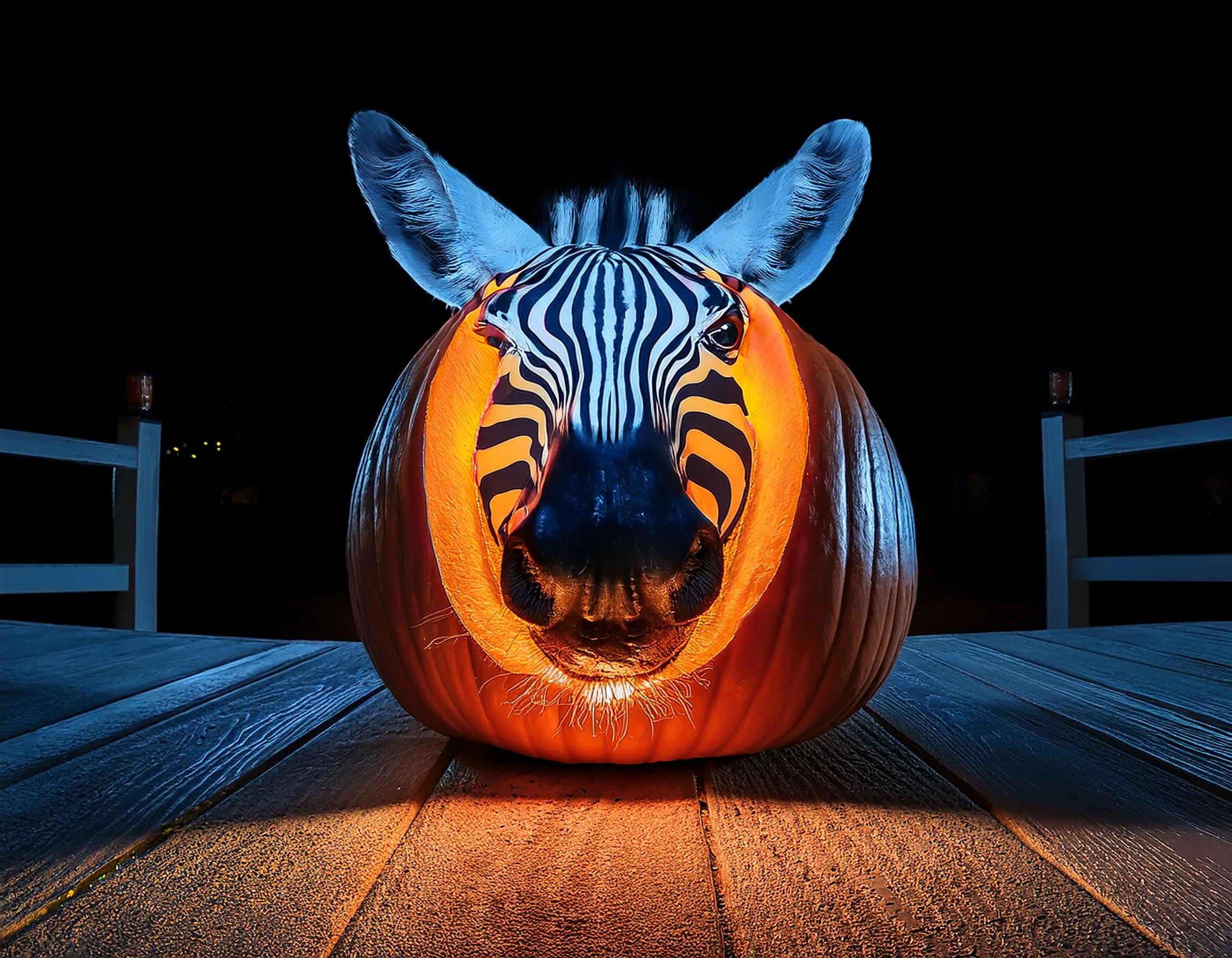 Prompt: A zebra's head carved out of a pumpkin, lying on the porch at night, glowing from the inside