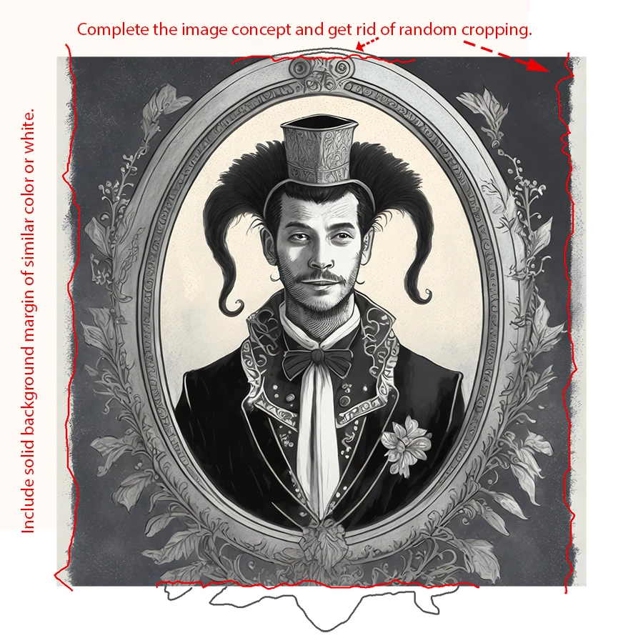 Does anyone have a working prompt for consistant margins around rendered images? Preferably with definable margins, or at least simply providing a reliable solid margin to avoid the awkward clipping of every image. I've included an example of the desired outcome.