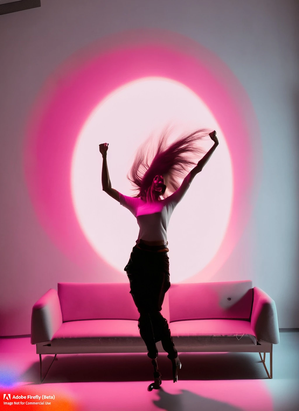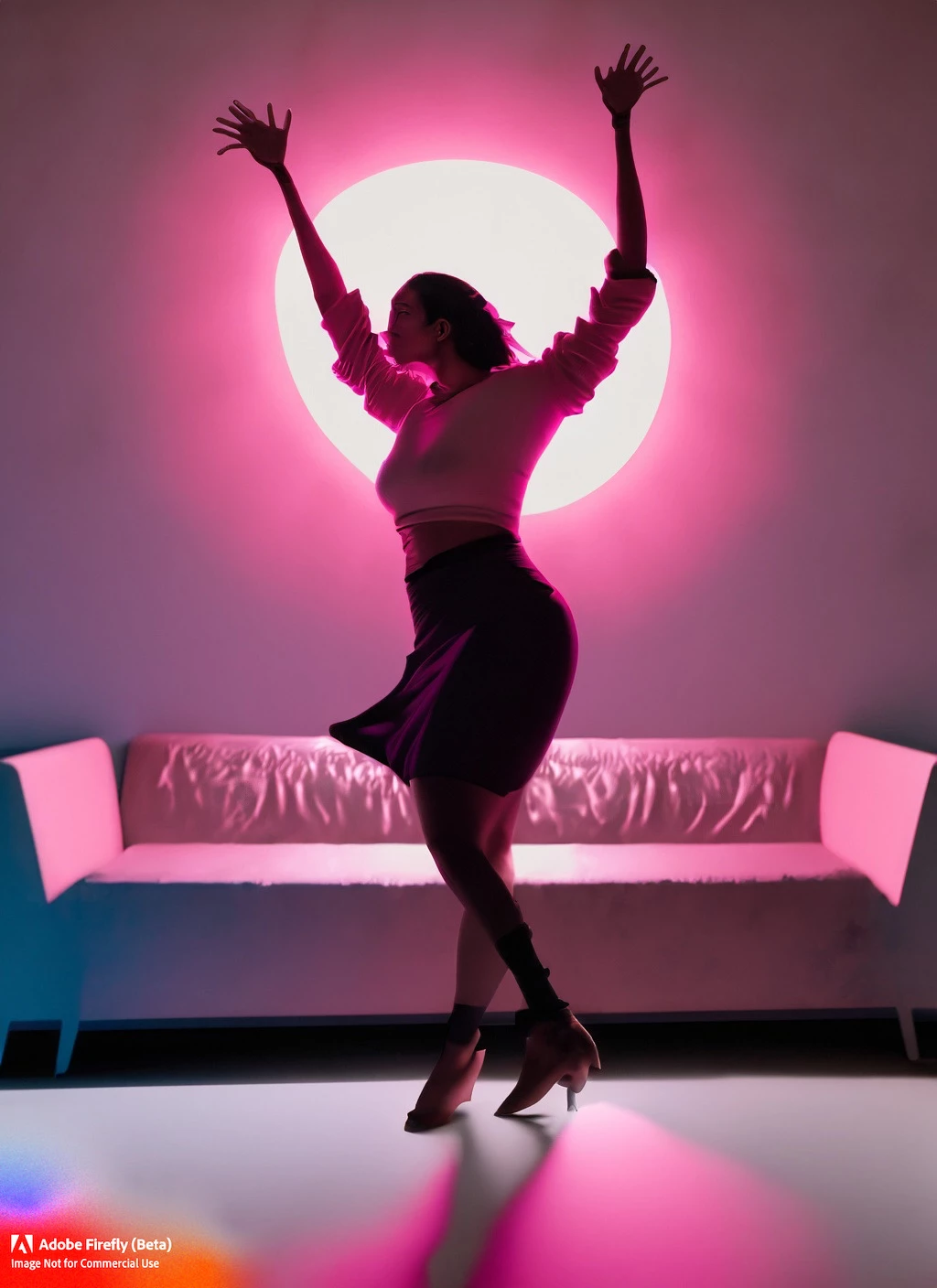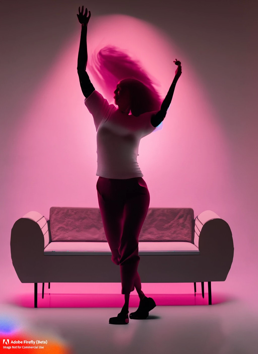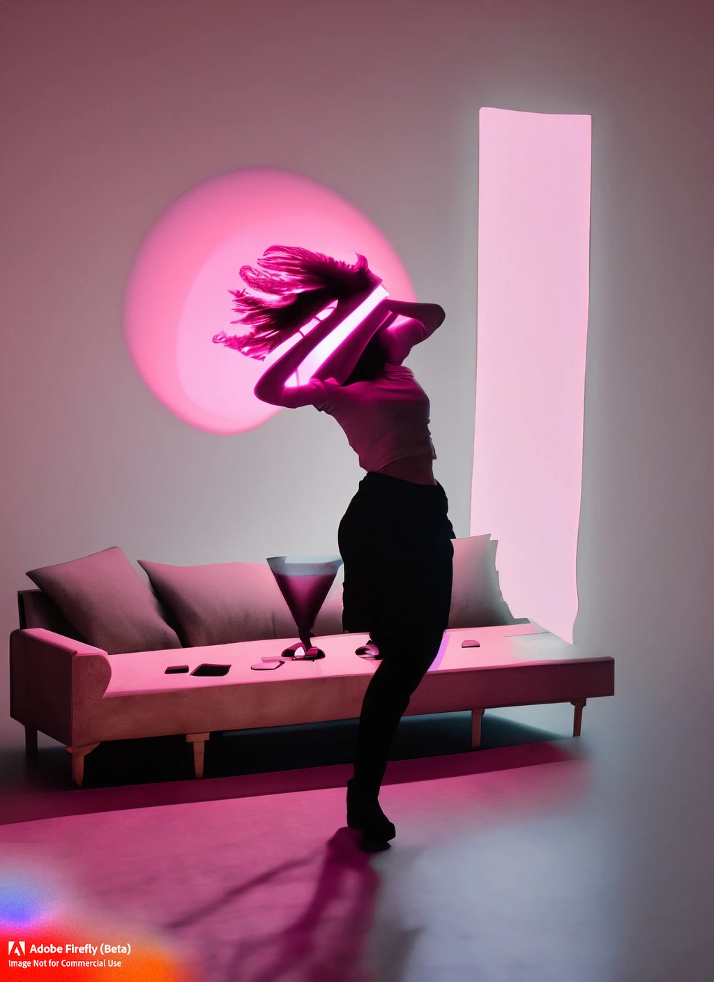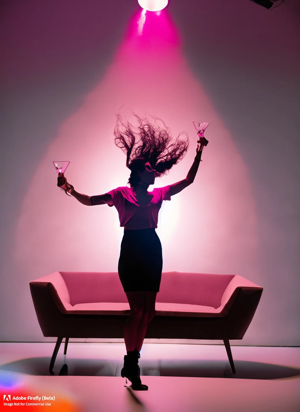 Silouhette of a woman dancing with her hands up and her hair floating, with a pink spotlight on top of her head throwing a pink cone of light around her, and a simple background with a modular sofa, a table with martini glasses, and a window