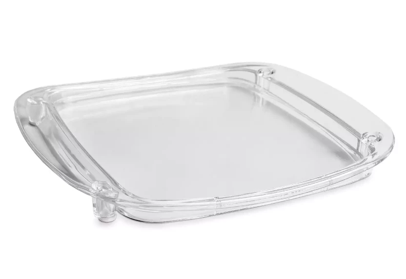 "Transparent tip tray on a wooden counter"