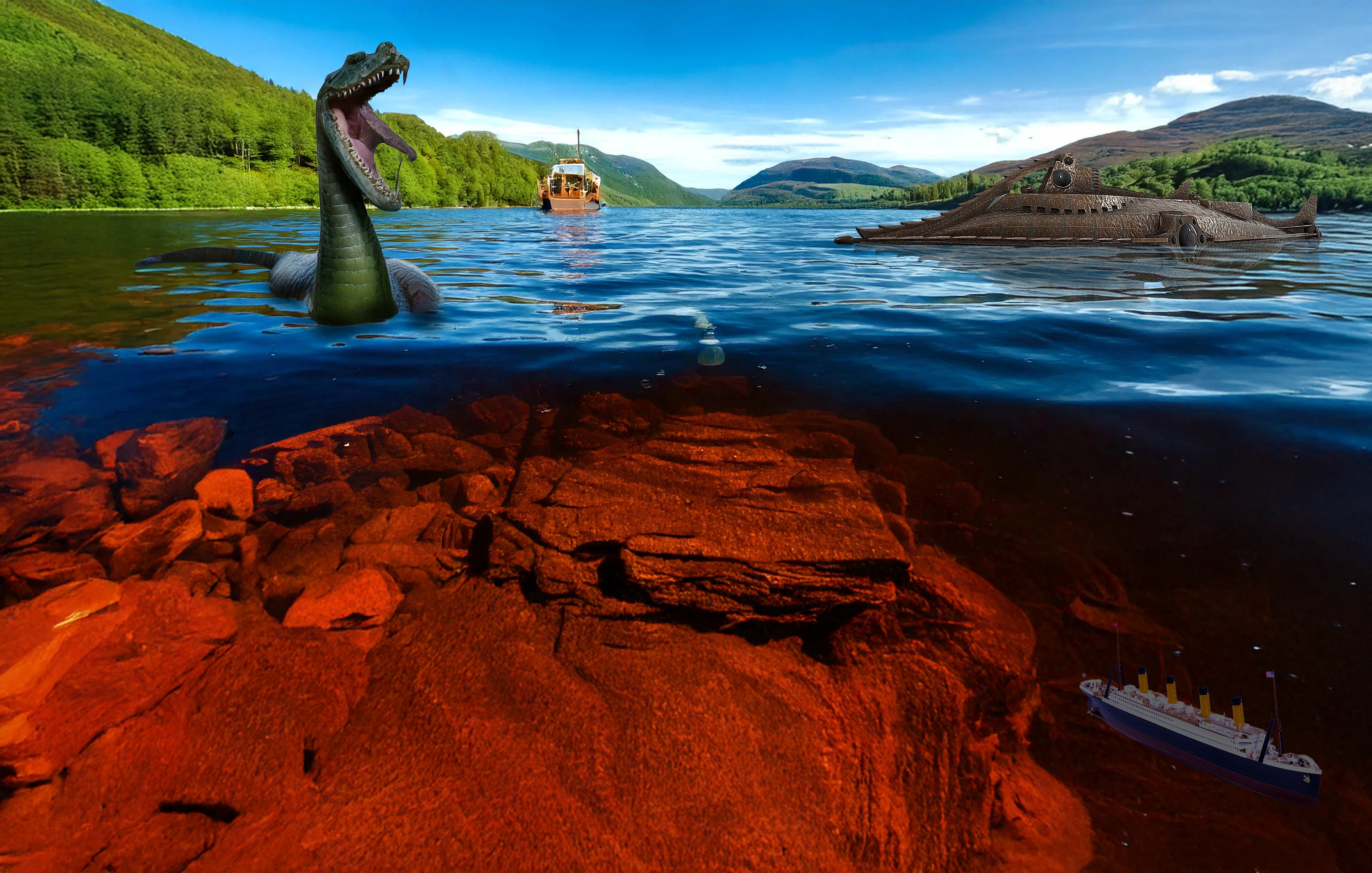 Firefly Loch Ness BG, firefly monster, gen expand underwater, composit monster, Titanic and Mr. Nemos sub
