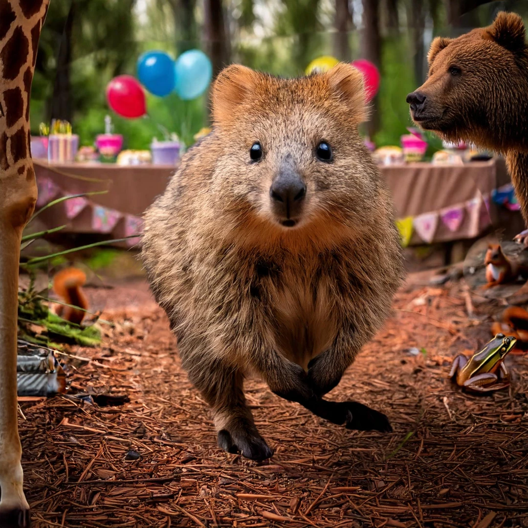 I started with a Generated image of a quokka (Australian animal). I love them!!  They seem to appear to have a constant smile on their face.  Then, I brought that image over to Adobe Express and used the "Insert Object" feature. I added animal friends along the forest and a decorated table to celebrate life!