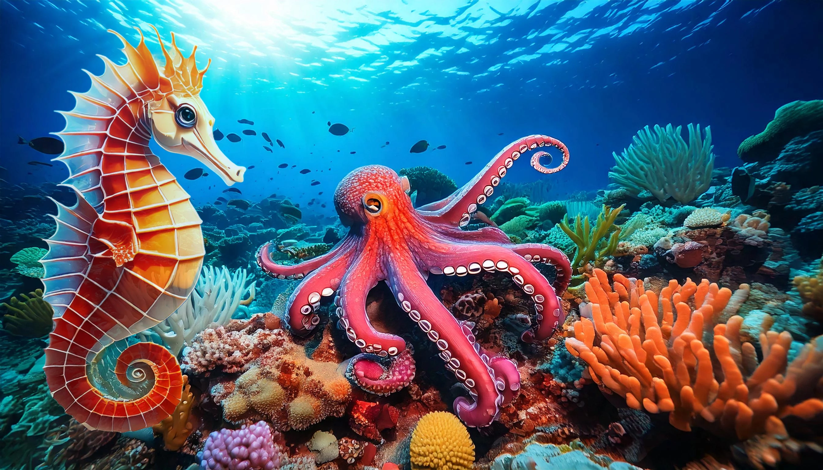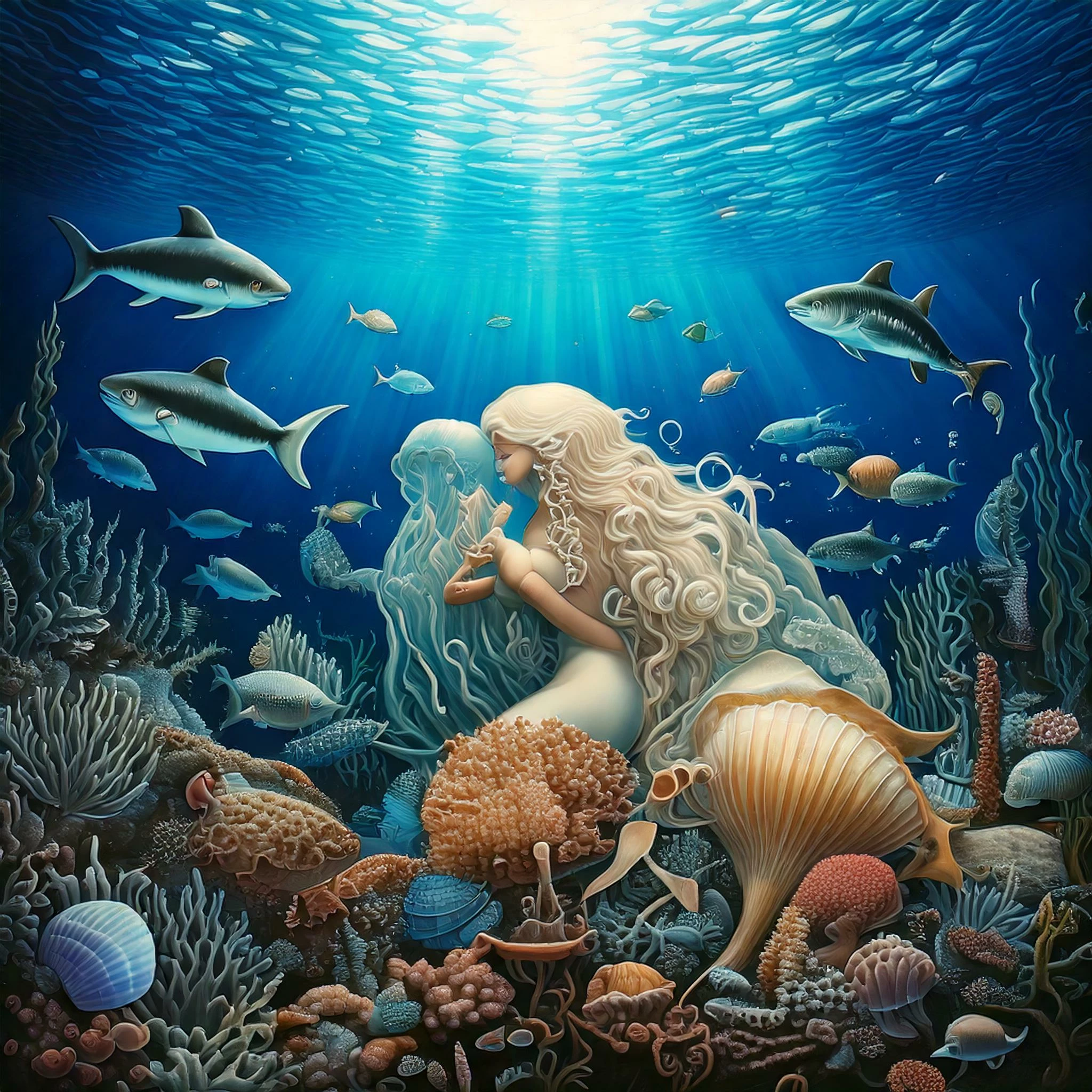 It started as a Firefly generated drawing of a cuttlefish. In Photoshop, after removing some debris with the Remove Tool, I added the crab and expanded coral reef using Generative Fill after enlarging the image with the Crop tool. The balloon and the party hat are Generative Fill using the Selection Brush at 70%.  The birthday cake is from Adobe Stock (the water put the flames out, sadly), with an overall color tint to blend with the scene. Shrimps are Generative Fill (Selection Brush again). Finally, I took the whole scene into the Camera Raw filter to enhance the watercolor-and-ink look with the Clarity slider and desaturate the colors.