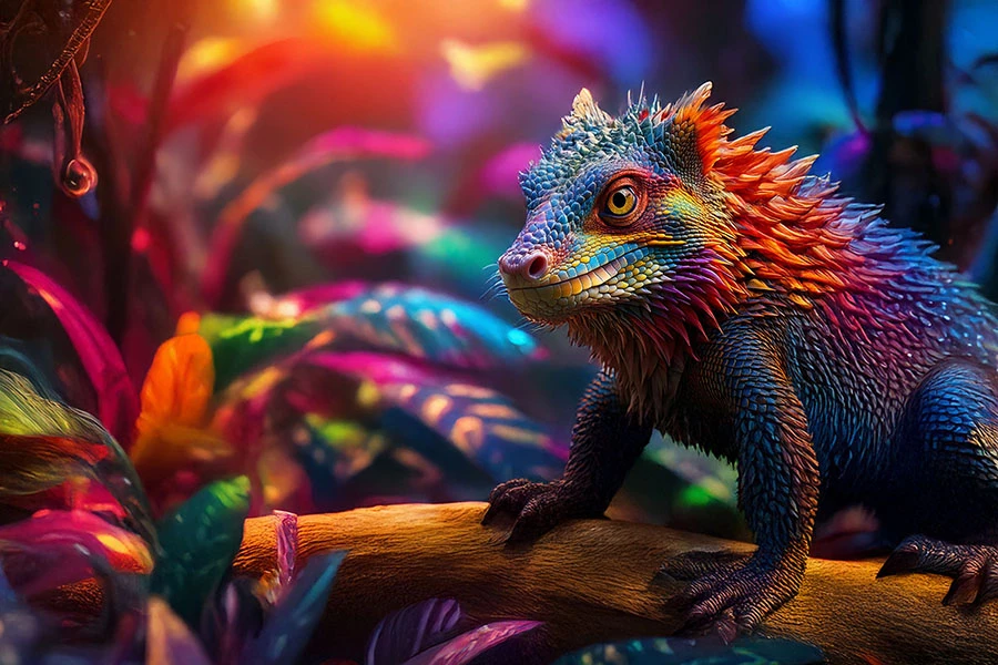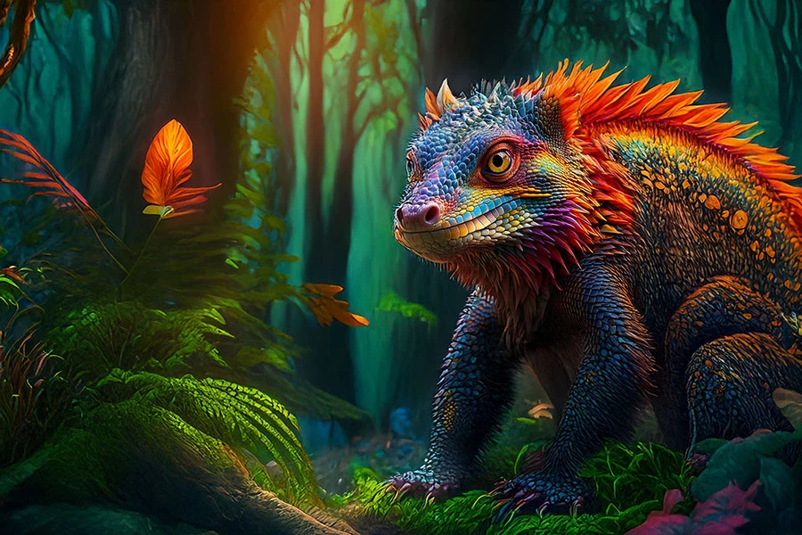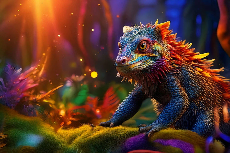 Begin in Firefly, Photoshop, Adobe Express, or Illustrator (vector) Generate a starter image of an exotic animal, fish, insect, or other arthropod (no limits, so long as it's alive). Ancient animals are okay, so if you’re a dinosaur fan, go for it! Create an environment around it, using Photoshop or Illustrator or any other Adobe tools you prefer. Add other creatures or plants to tell a story and complete the scene. Be as poetic or as whimsical as you like!
