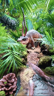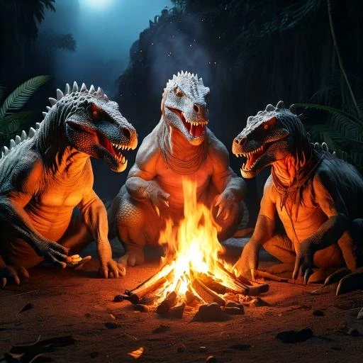 three dinosaures sitting around a camp fire (before the troubles get in)