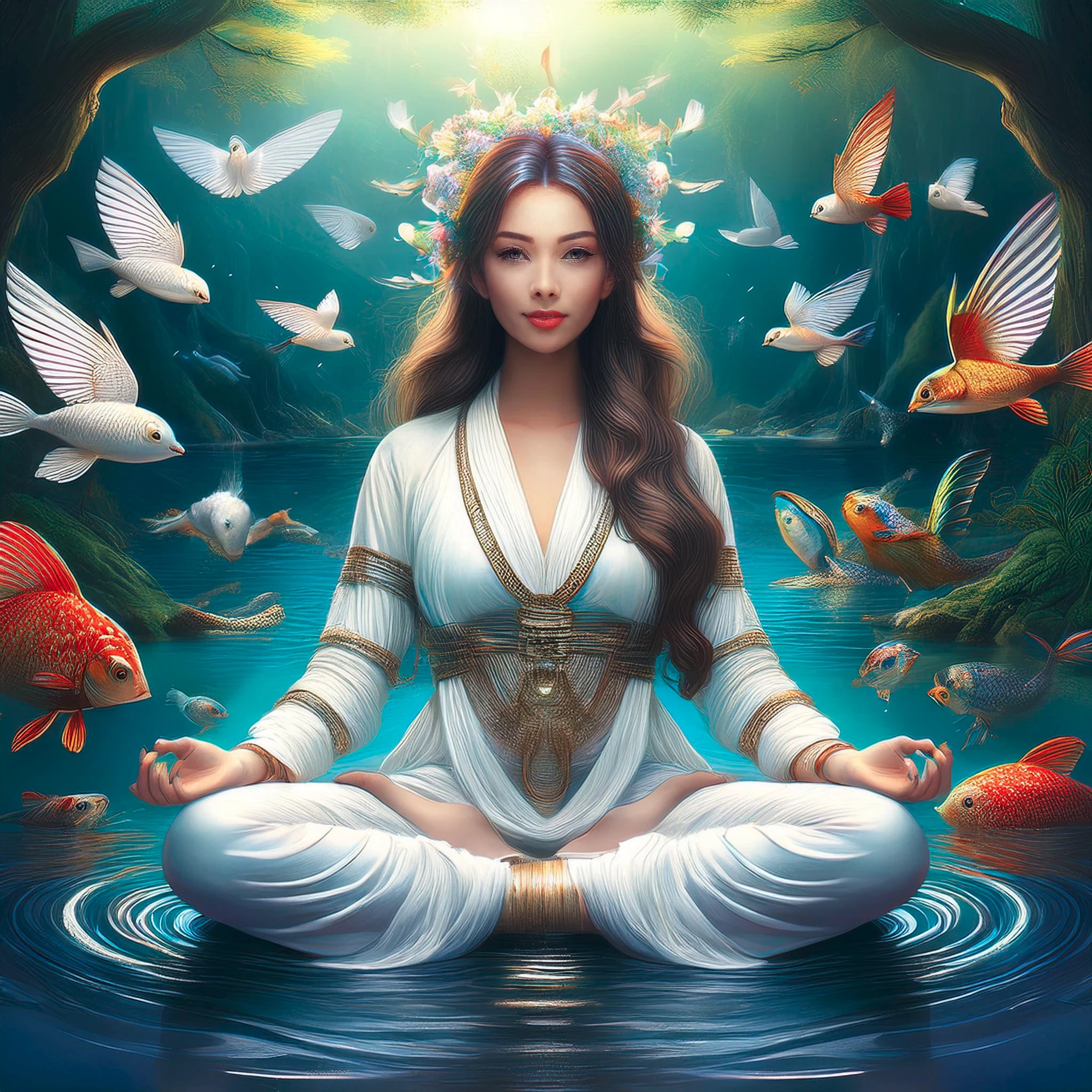 Prompt: create an image of a young female looking straight into the lens in lotus posture at the side of a pond where several fishes are rearing their heads above the water and many other creatures are coming together in a circle around her, with some birds landing in her hair.
