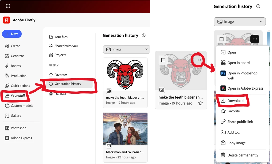 my adobe firefly account have some dowload troubles. ı can not download anything (photo and video), please help me about this feature. I can not working on my project. My download button is not working.