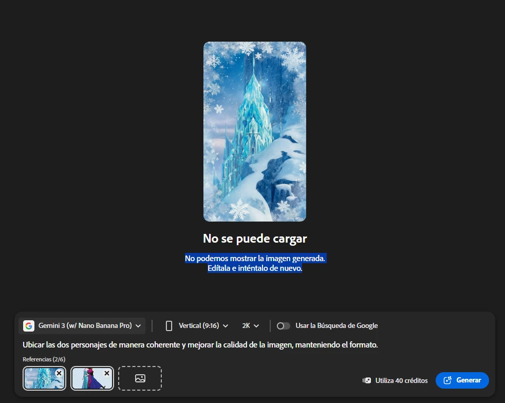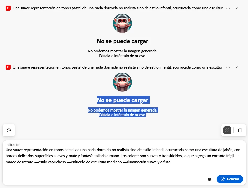 En Texto a Imagen: Desde hace un tiempo sólo me genera casi la misma imágen cada vez que cambio detalles en el prompt. Ahora además todo el tiempo me aparece ese texto: Que no se puede mostrar la imagen generada.