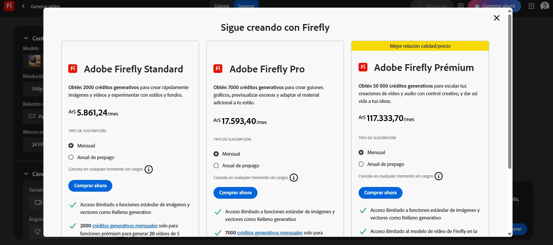 actualmente cuento con un plan Creative Cloud, en el cual está incluido Firefly. Sin embargo al usar Firefly en la web me indica que debo adquirir un plan. Solo pude generar 2 videos