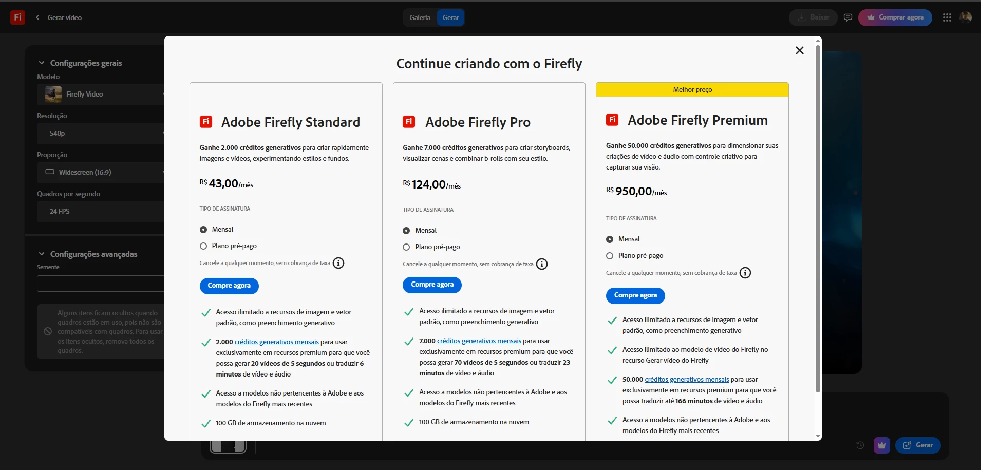 Não estou conseguindo usar o firefly mesmo tendo 1000 créditos generativos mensais. Fica aparecendo a janela de compra do firefly.