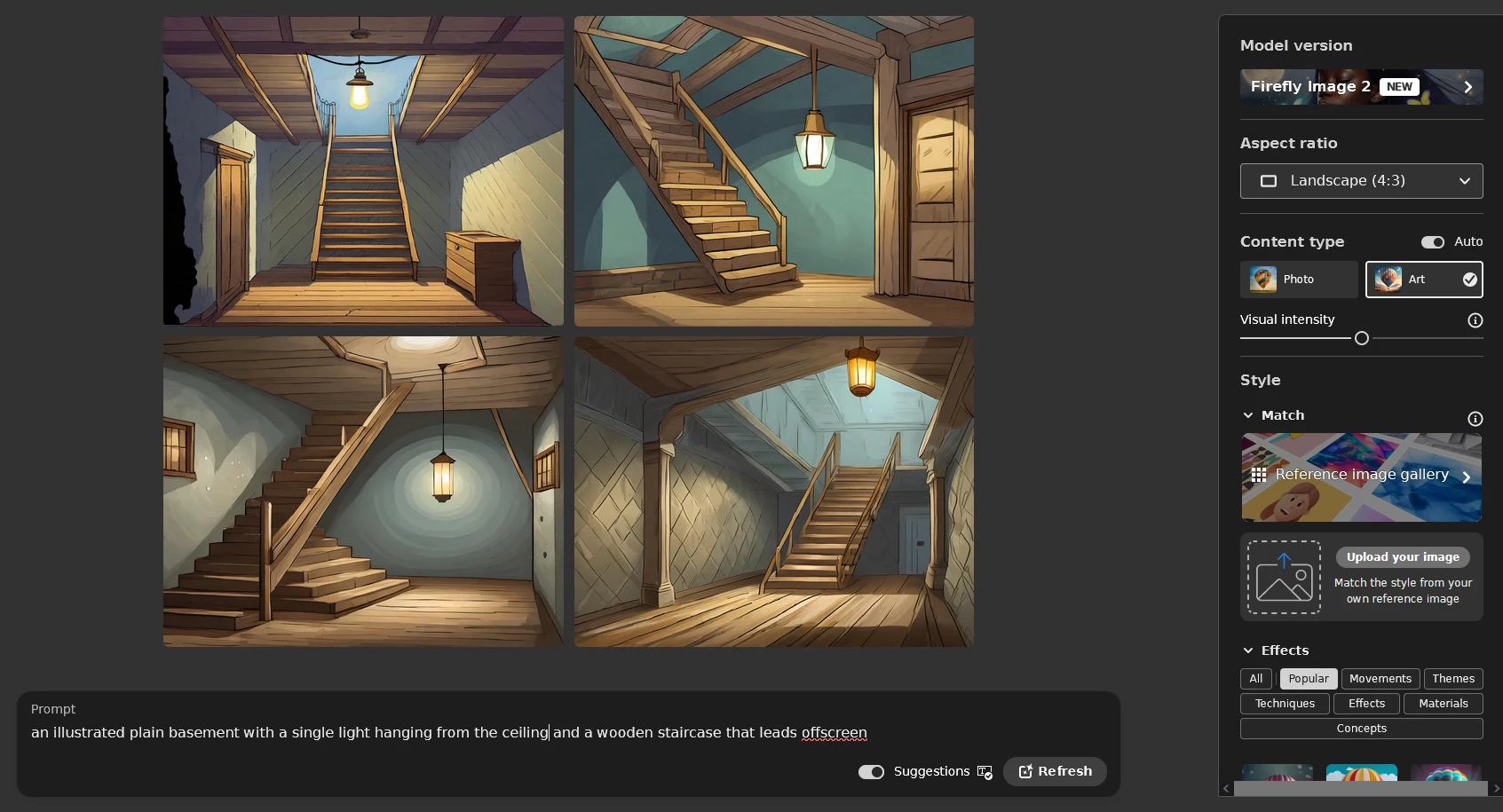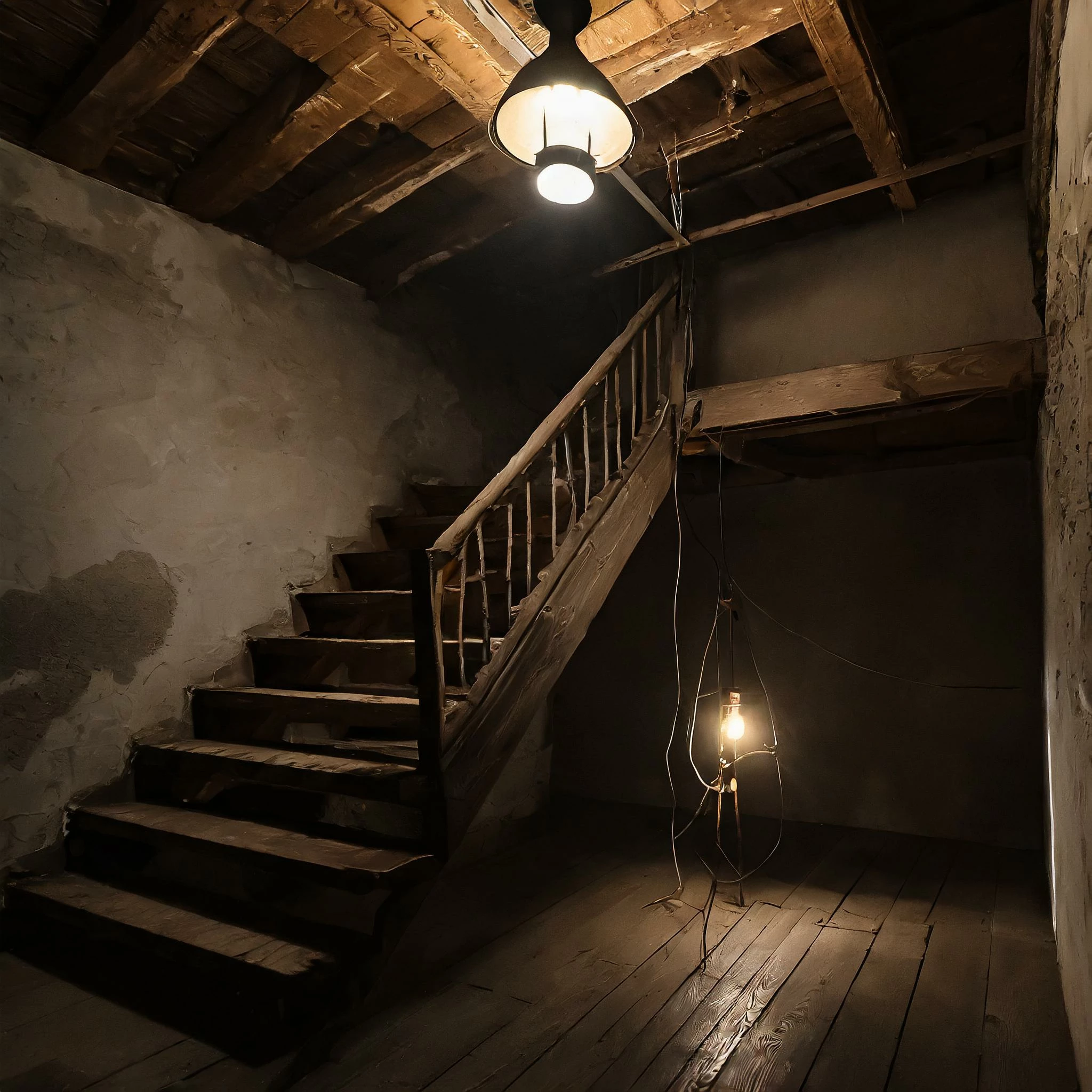 I'm trying to create an illustrated image of a plain basement, like the kind you'd see in an old home. I started with "an old basement with a wooden staircase leading up and a single light hanging from the ceiling", and added adjectives and descriptors multiple times trying to specify no doors, tunnels, balconies, and windows; no matter how I phrase it, I keep getting images with bright open windows and stairs that end in long balconies (like you would see in a house with a 2nd story banister). I can't get Firefly to make a basement that actually looks like an underground basement without it just making caves or ground floors, and I'm at a loss for what to try.