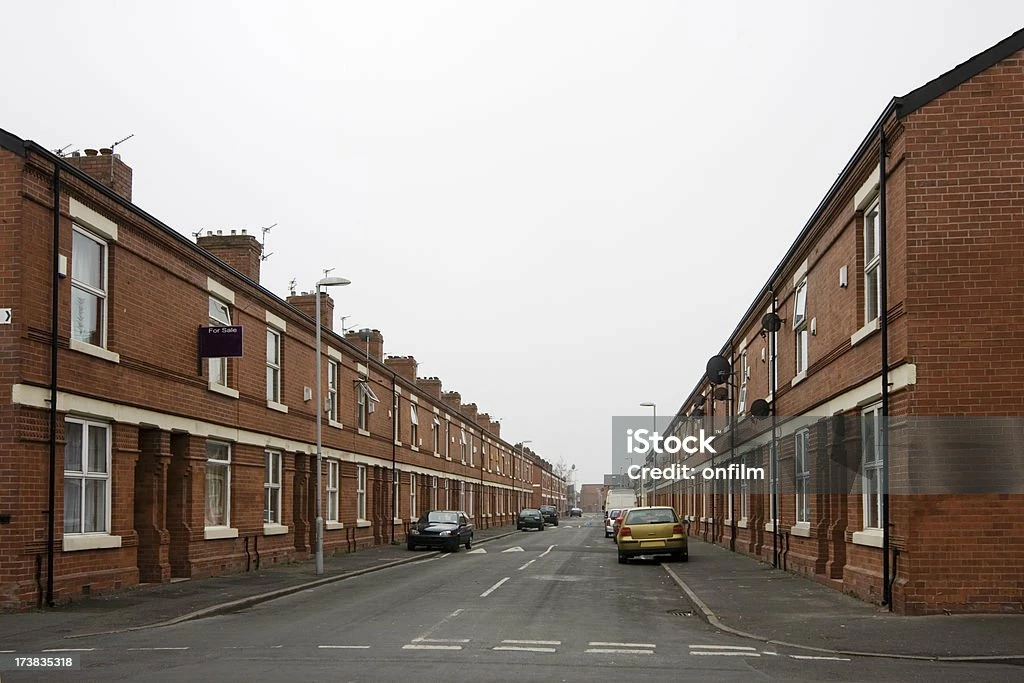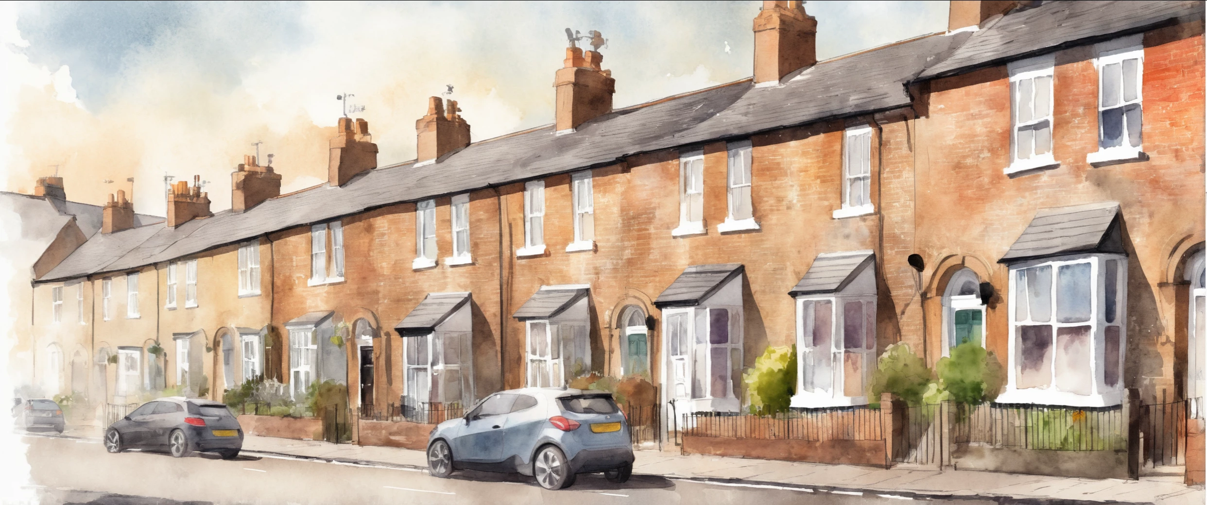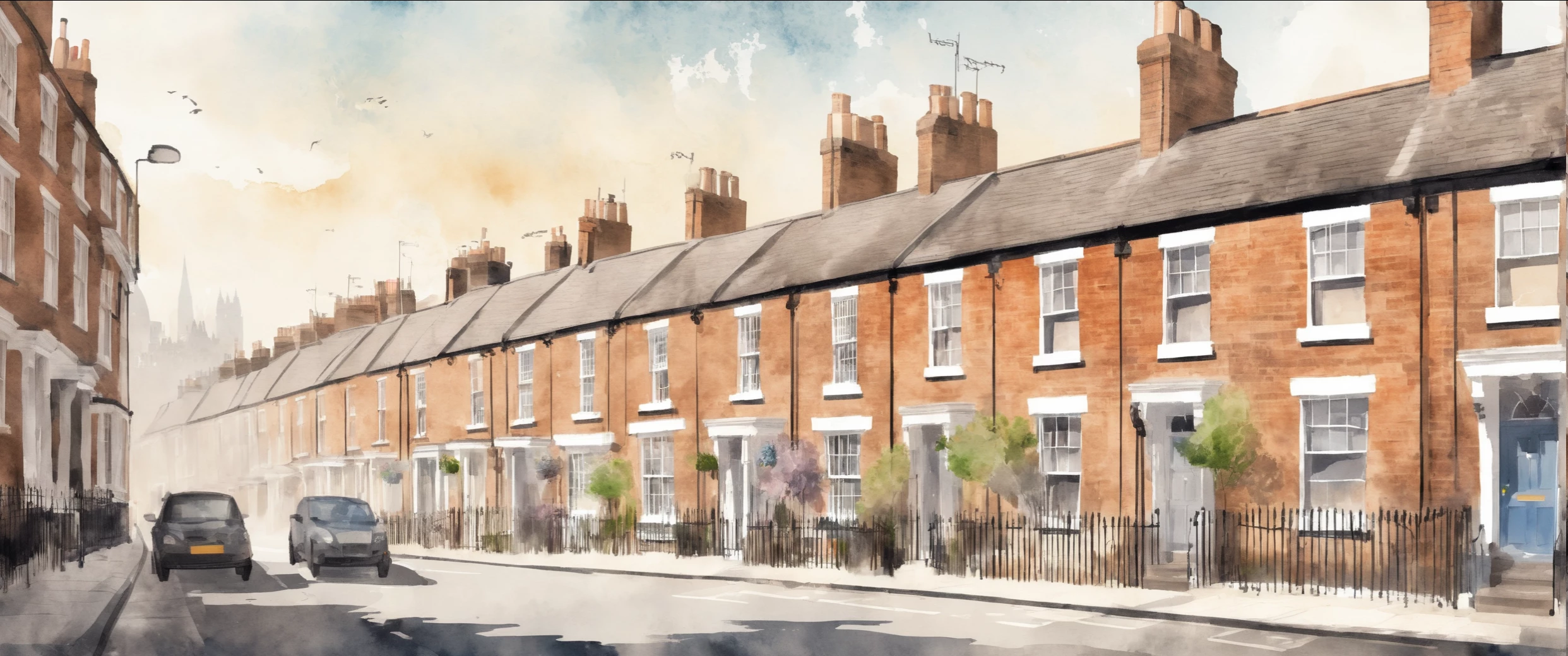 A watercolour of a row of victorian terraced houses on a roadside. (english british london )