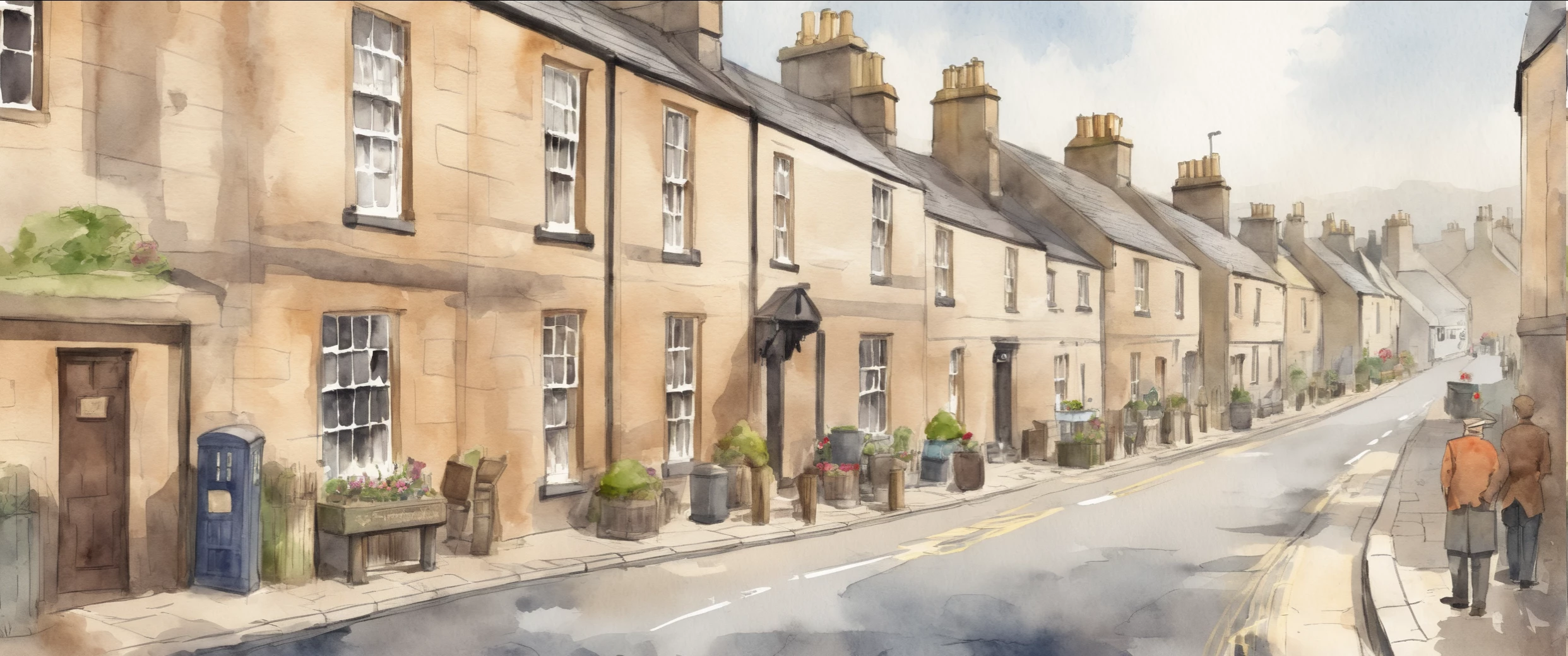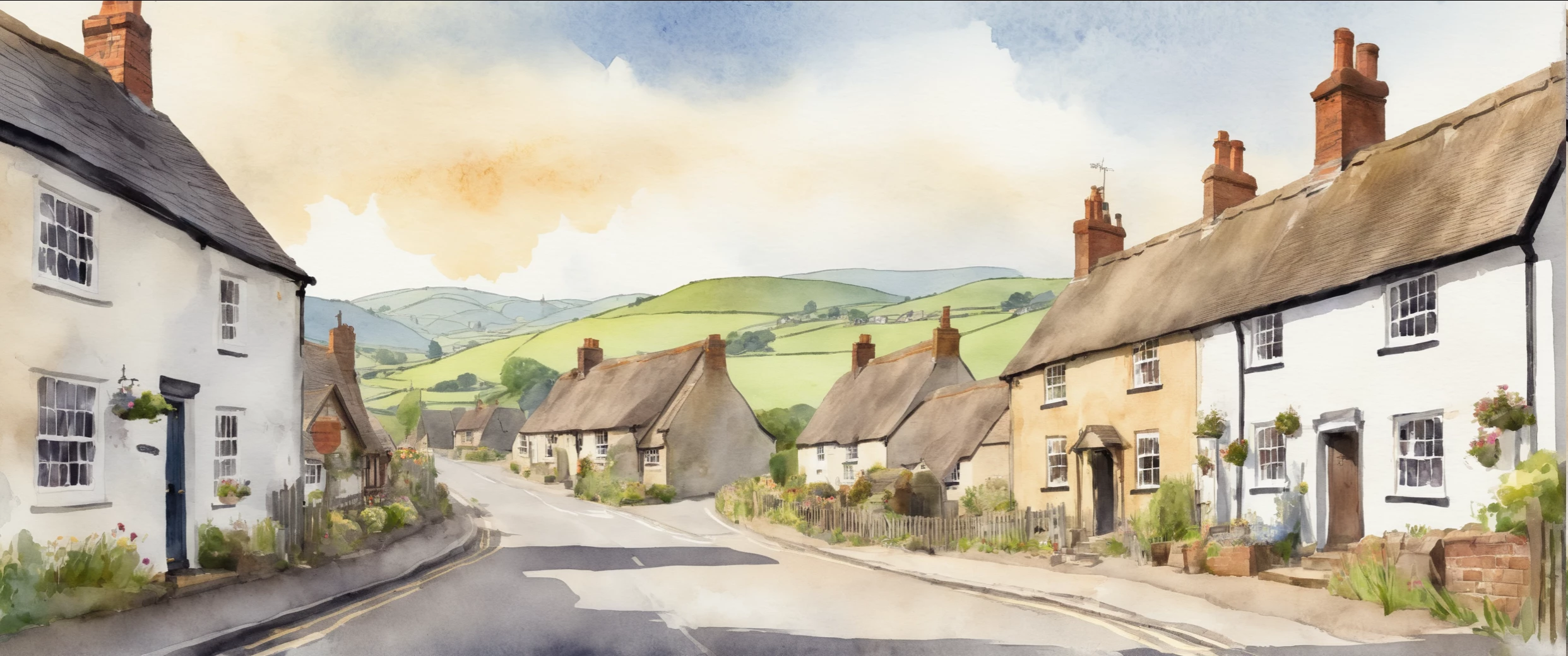 water colour painting of British village street with one lane and hills in the background