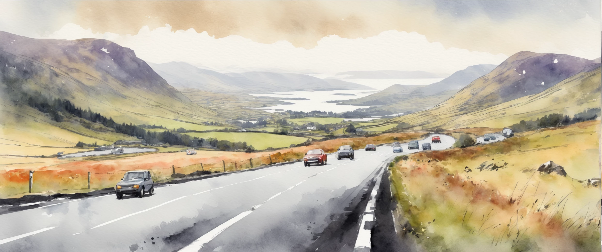 water colour painting of Scottish Highlands vollage with one lane and hills in the background, cars travelling on road