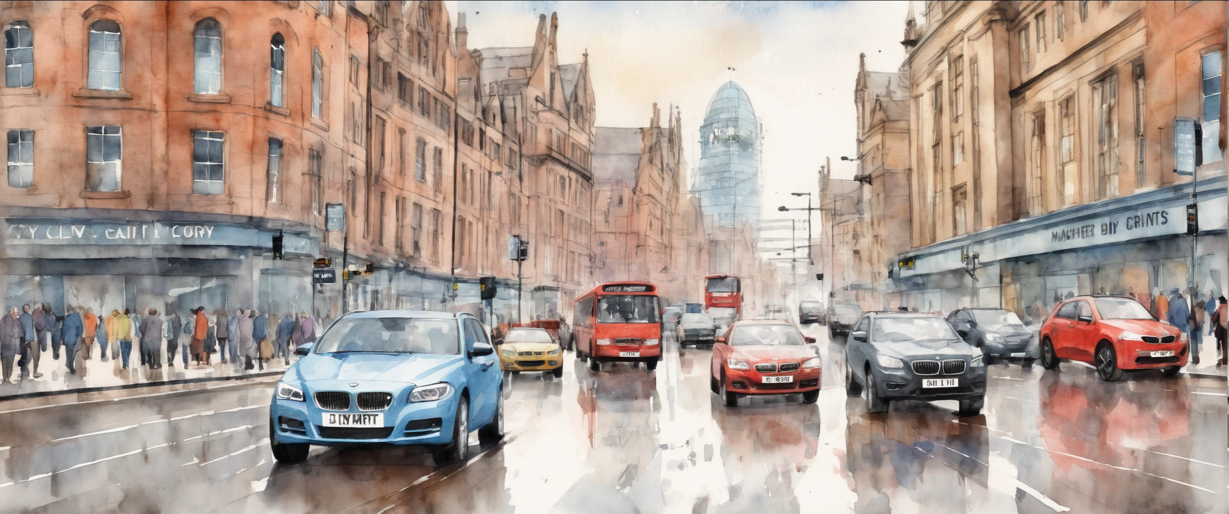 water colour painting of Manchester City Centre cars travelling on road