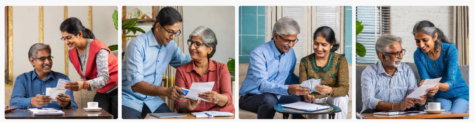 an older indian woman helping a young white caucasian man to pay their bills at home