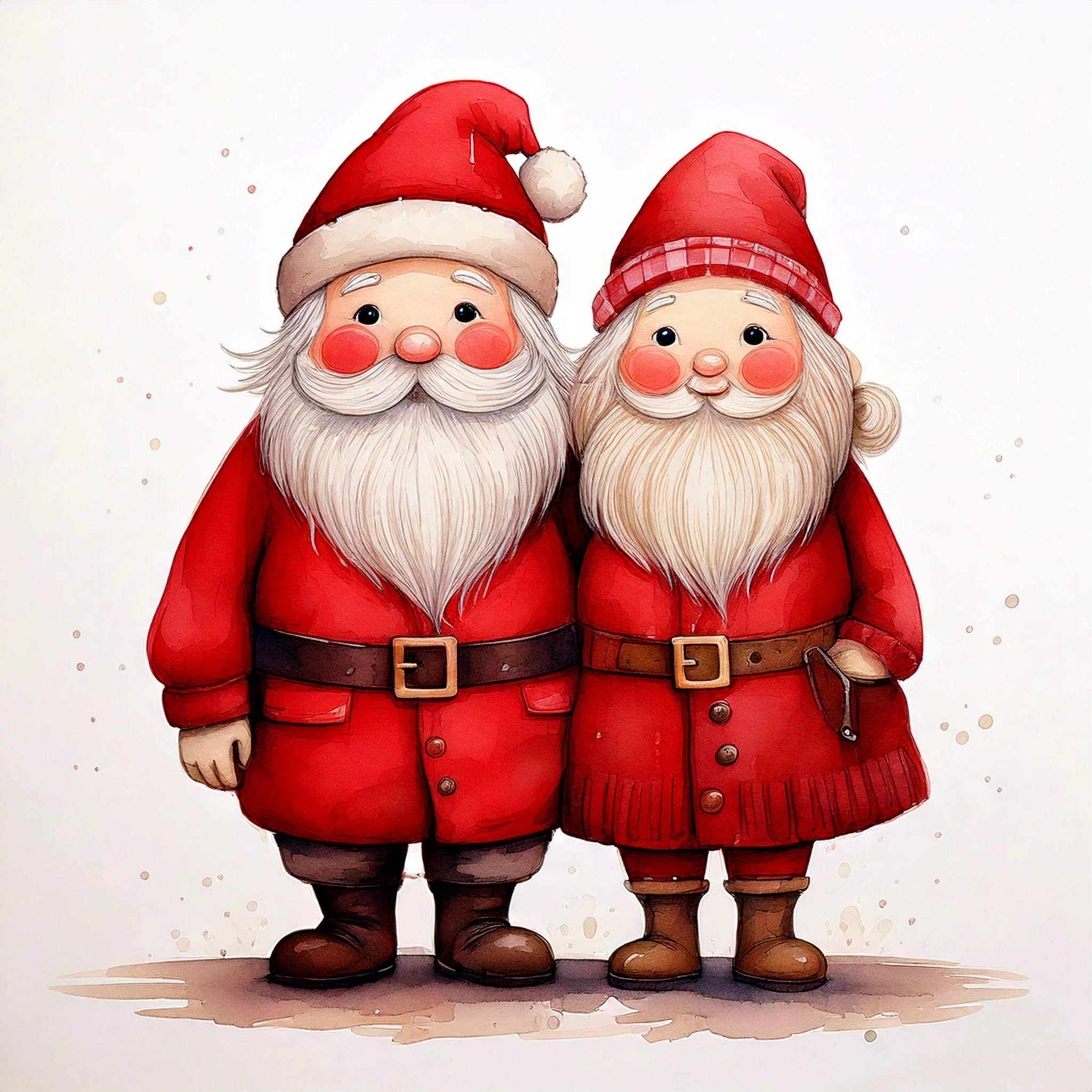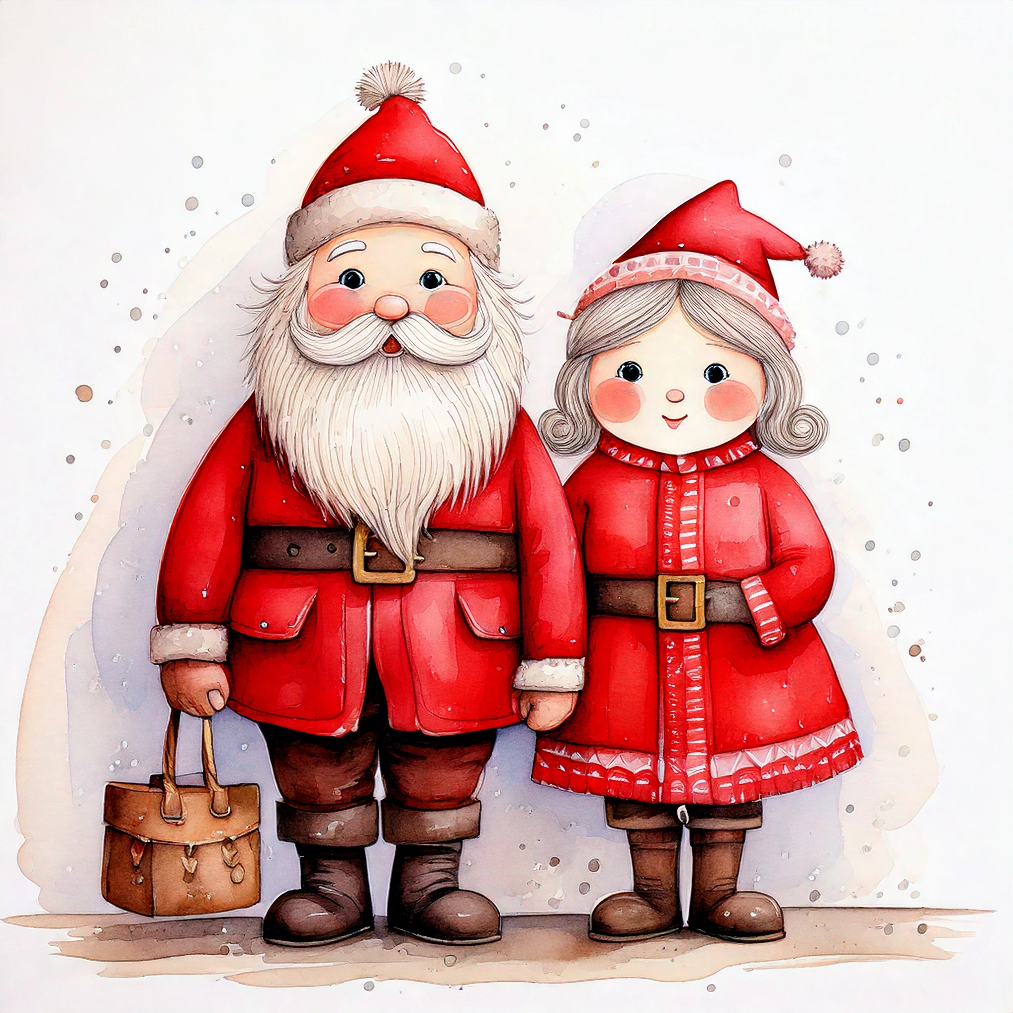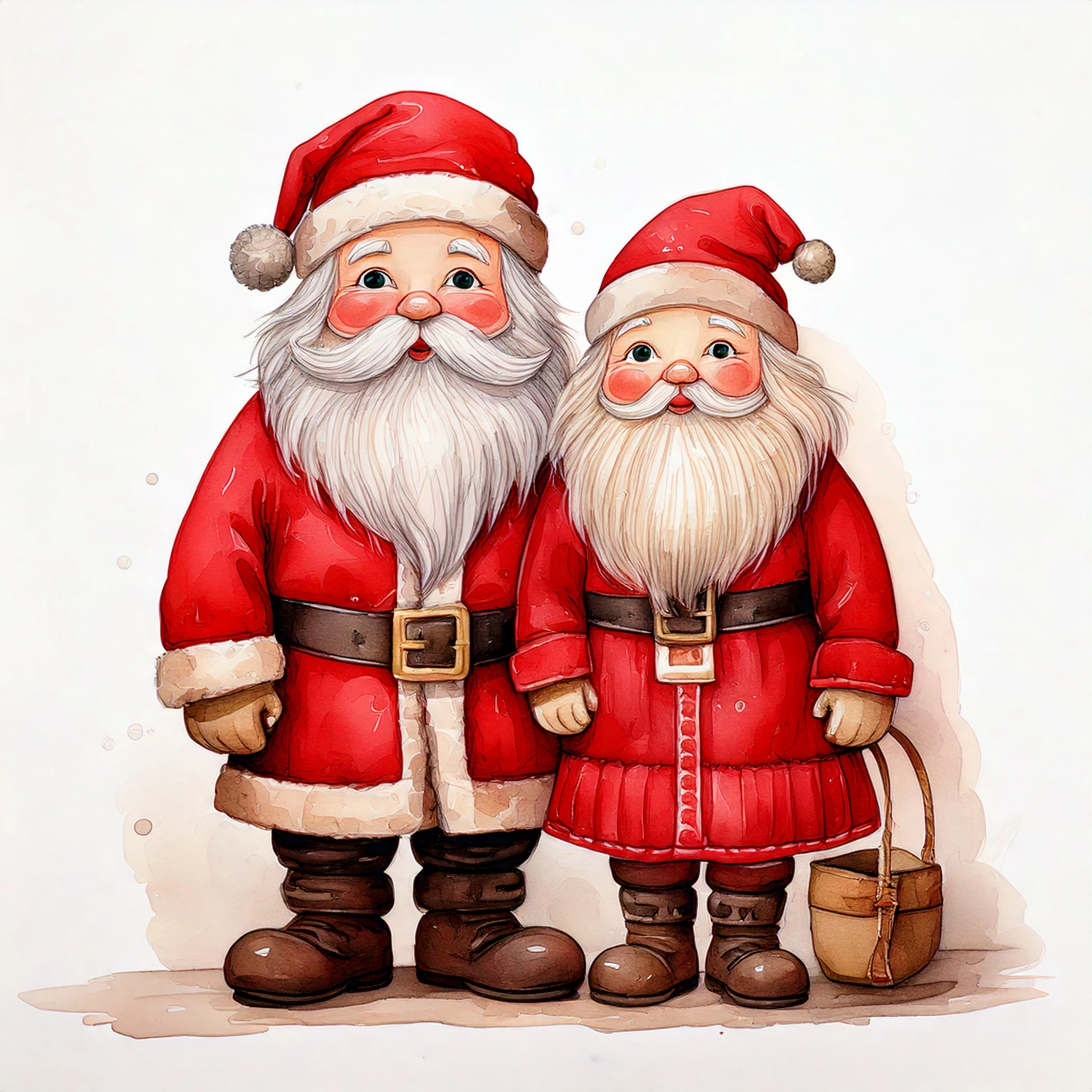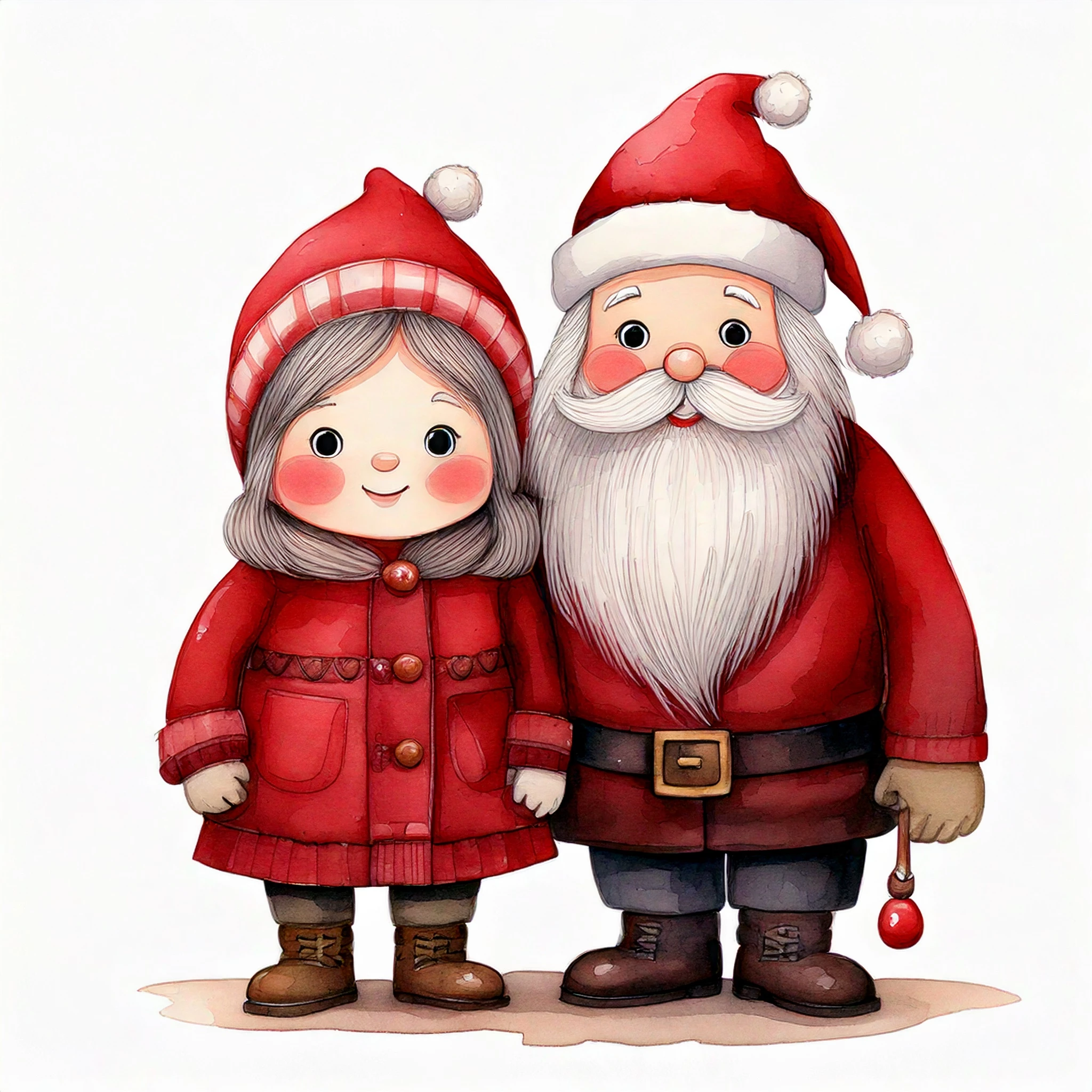 Cute Santa Claus and Mrs. Claus with rosy cheeks, muted red suit and brown boots, cartoon cozy watercolor, hand-painted, whimsical, muted warm colors, no harsh outlines, white background, delicate shading, storybook style.