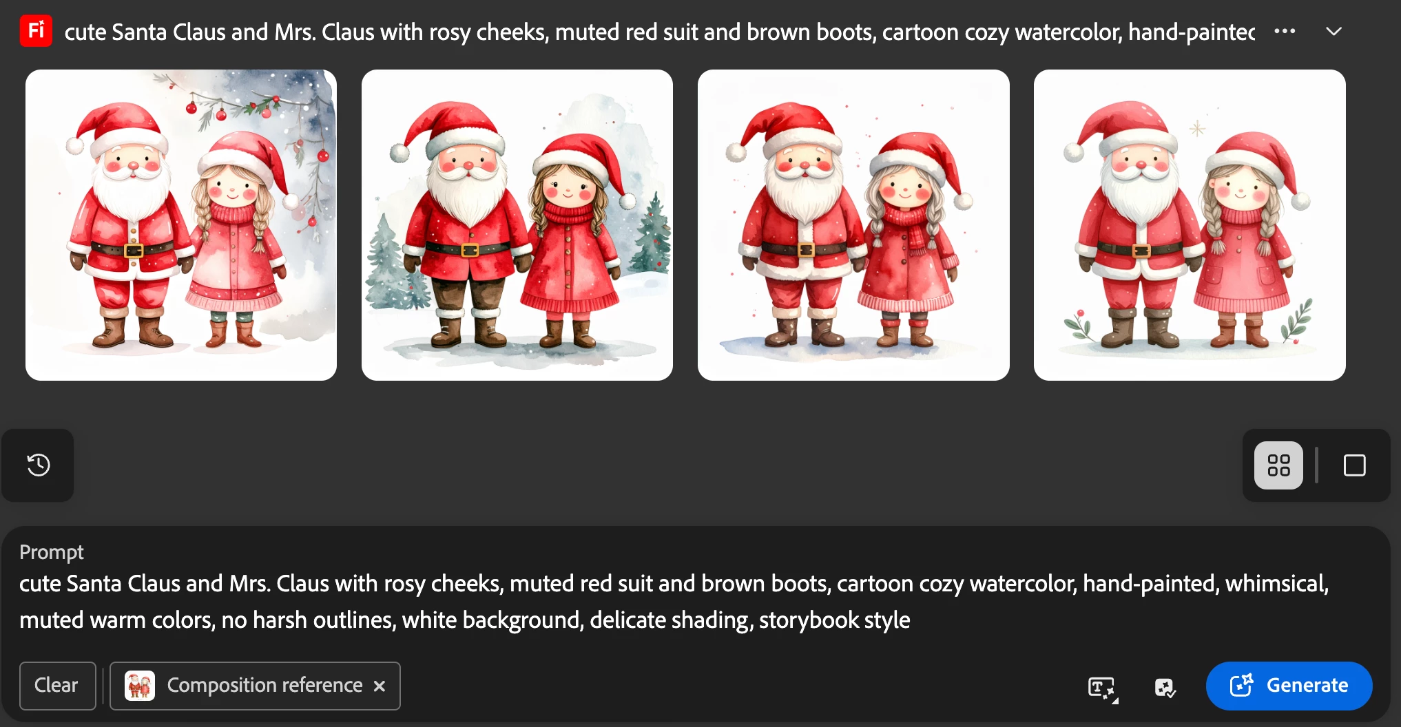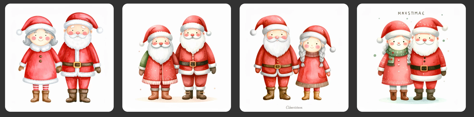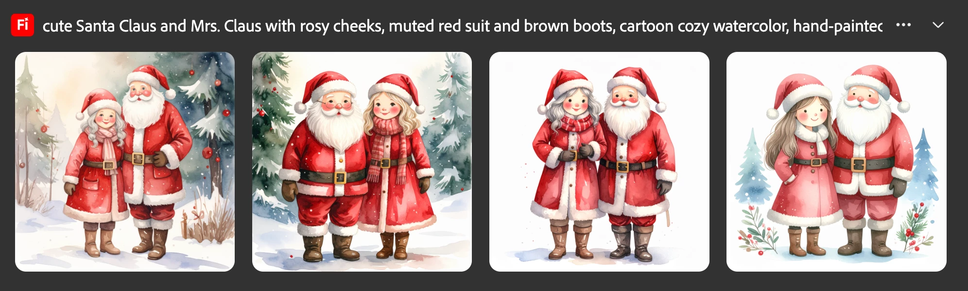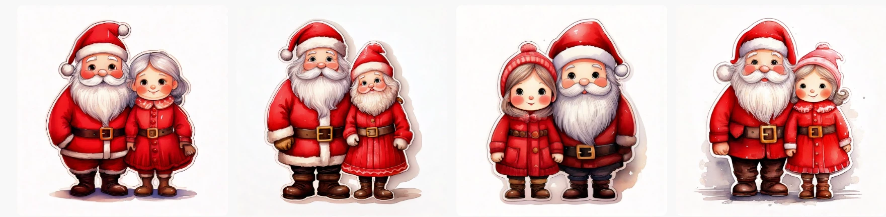 Cute Santa Claus and Mrs. Claus with rosy cheeks, muted red suit and brown boots, cartoon cozy watercolor, hand-painted, whimsical, muted warm colors, no harsh outlines, white background, delicate shading, storybook style.