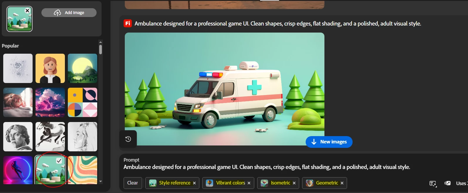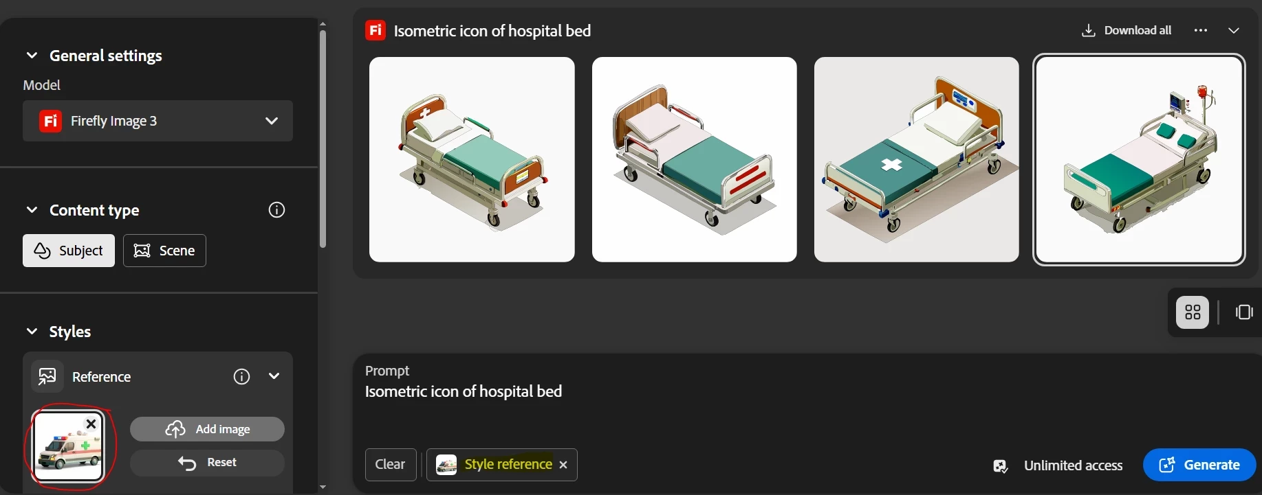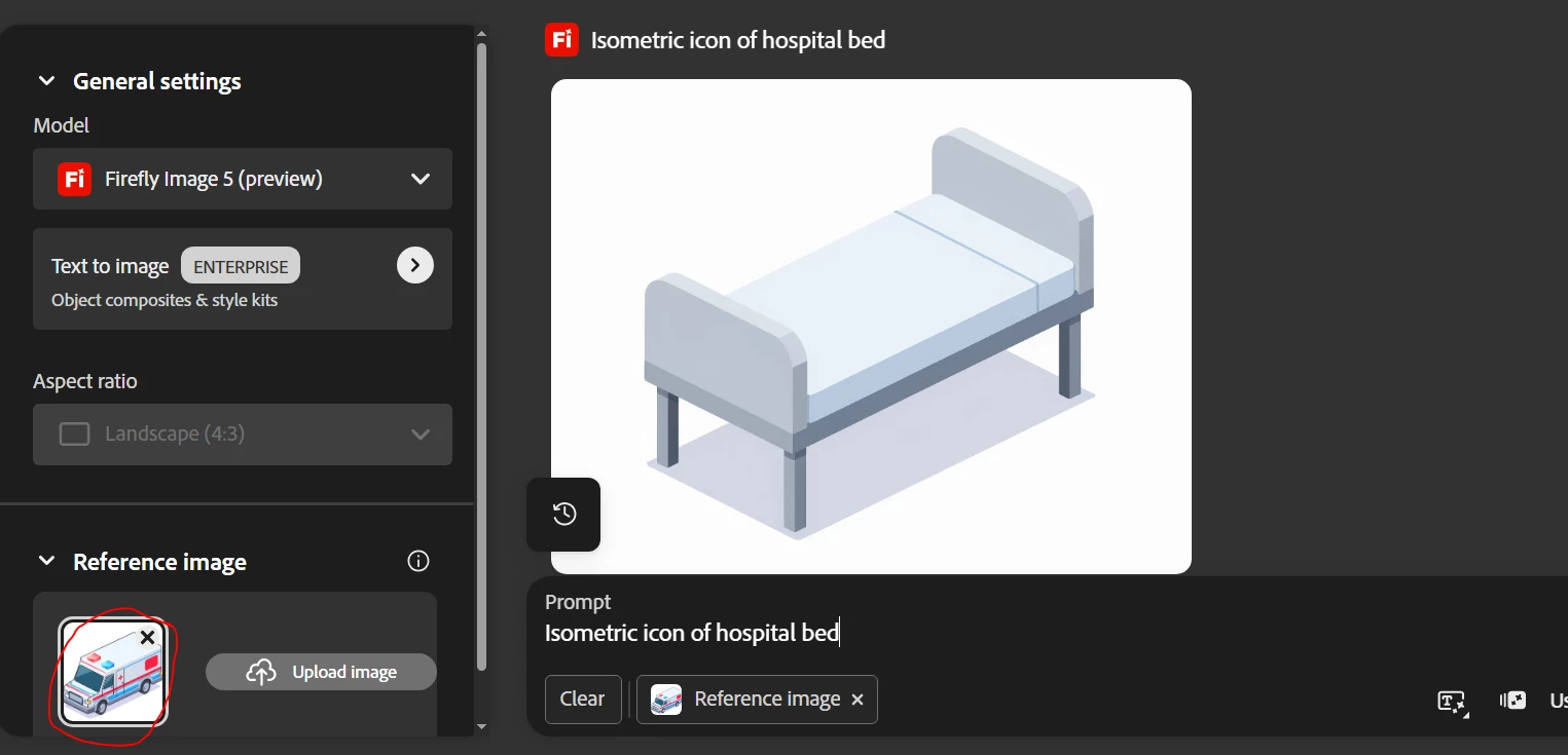 Wenn man in Firefly ein Referenzbild hochlädt, sieht das generierte Bild exakt wie das Referenzbild aus, auch wenn der Prompt deutlich verändert wurde (Bett statt Krankenwagen zum Beispiel)