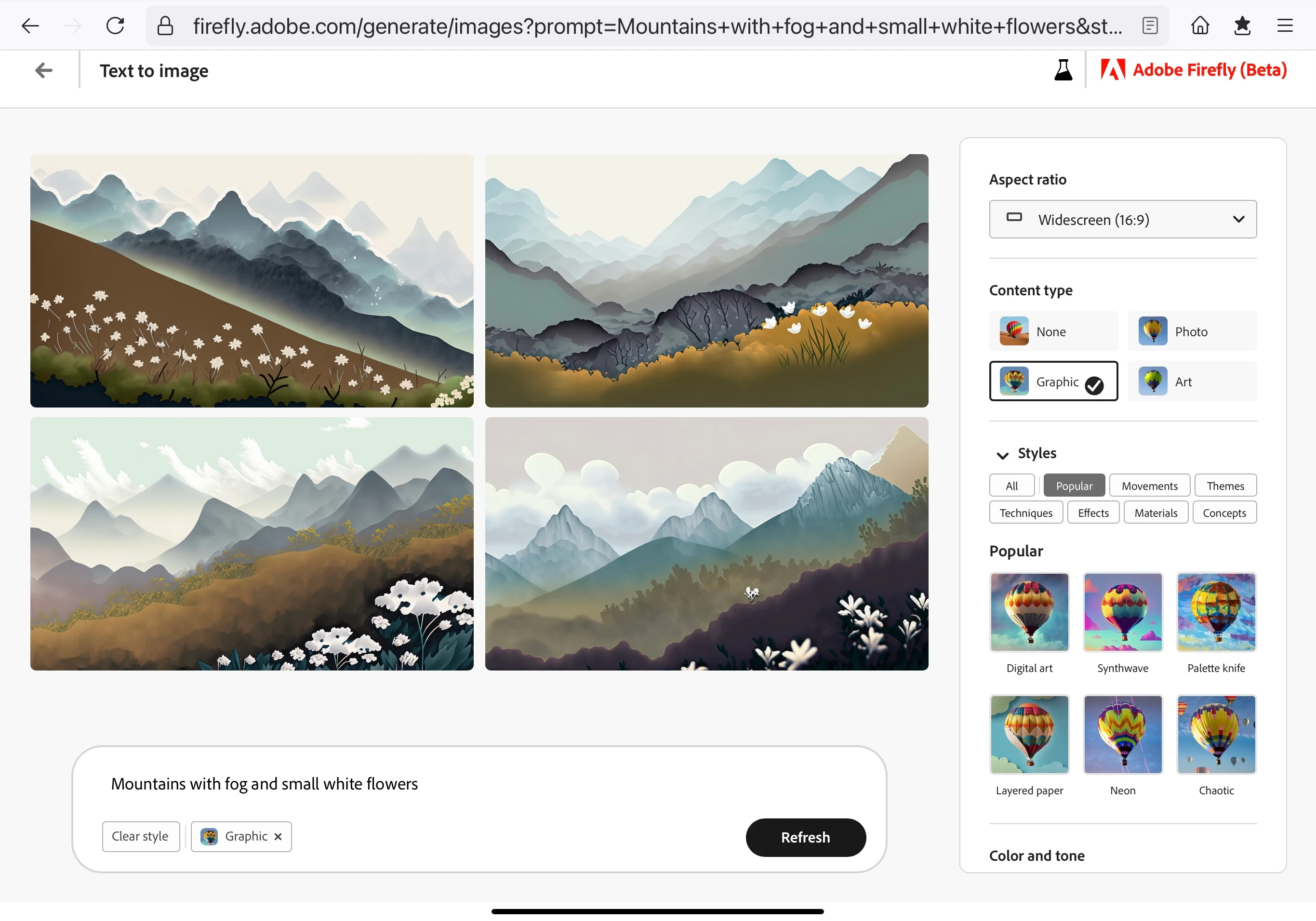 I am amazed at the number of times you can refresh an image on the new adobe firefly. I pushed the refresh button over 100 times ,got tired, and they were all different. More detail, less detail . A simple "mountains with white flowers " graphic widescreen (16;9) . Great job! I am Amazed! Thank you Adobe!