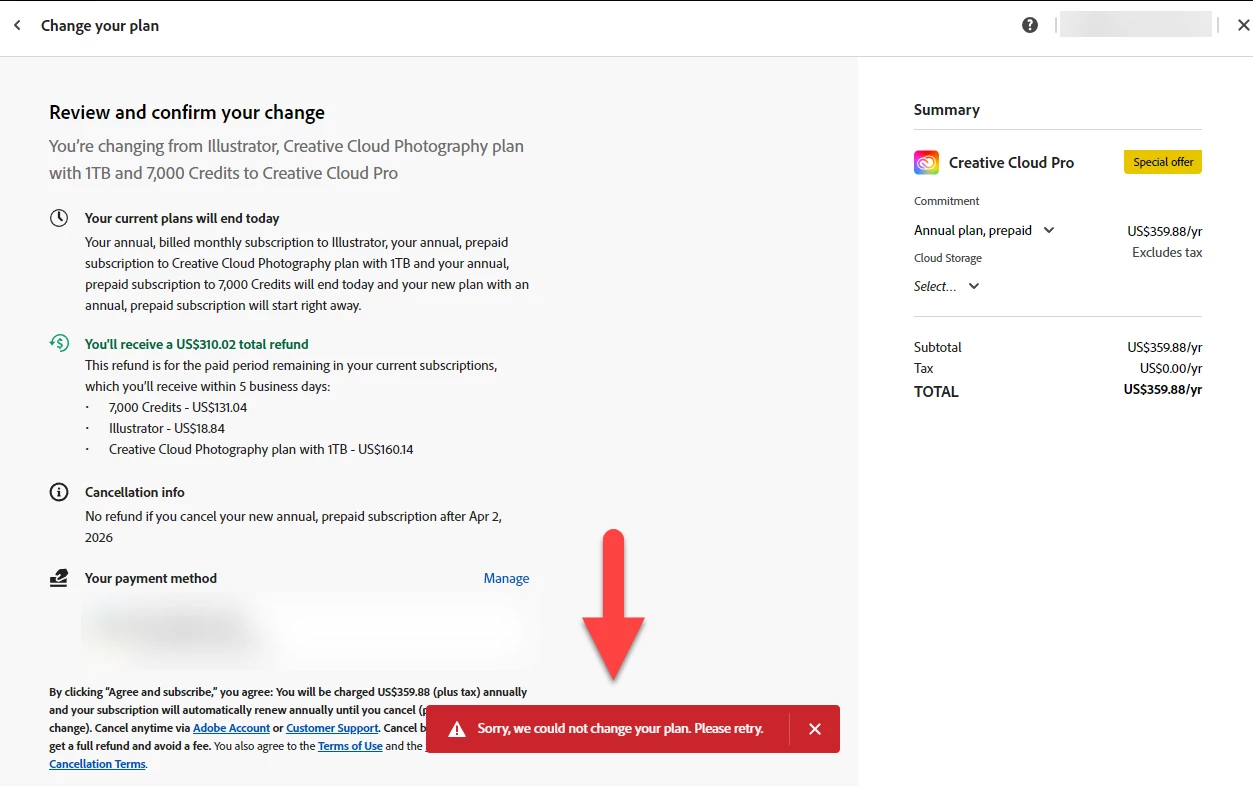 CC Pro switch from mixed plans errors: “Sorry, we could not change your plan. Please retry.”