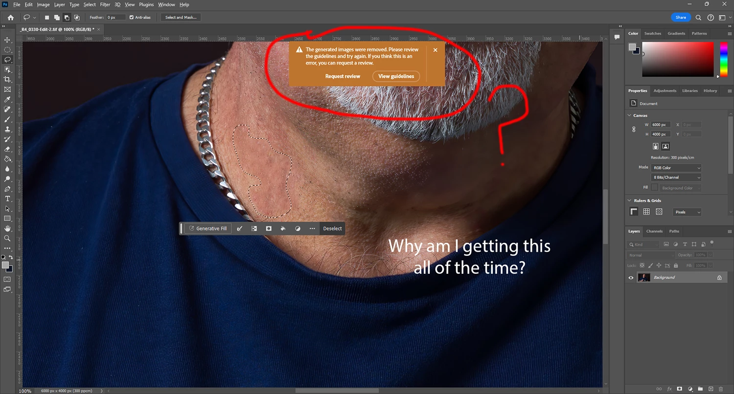 "The generated images were removed. Please review the guidleines and try again. If you think this is an error, you can request a review."