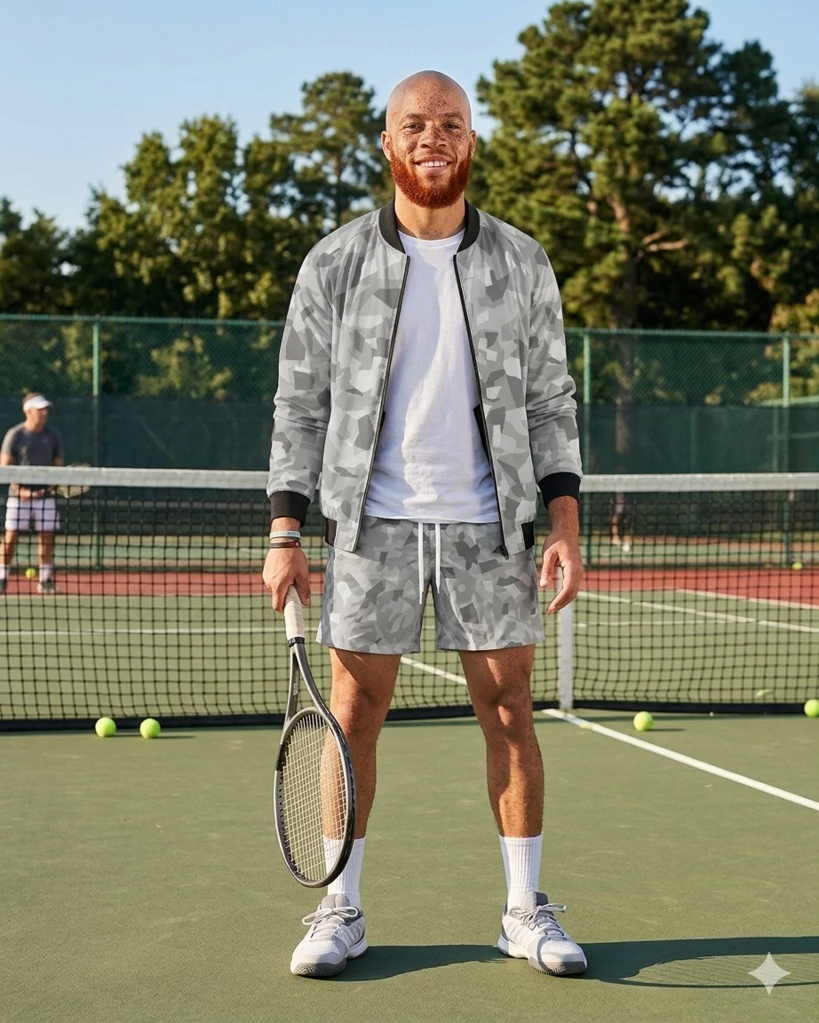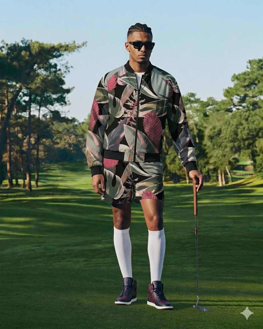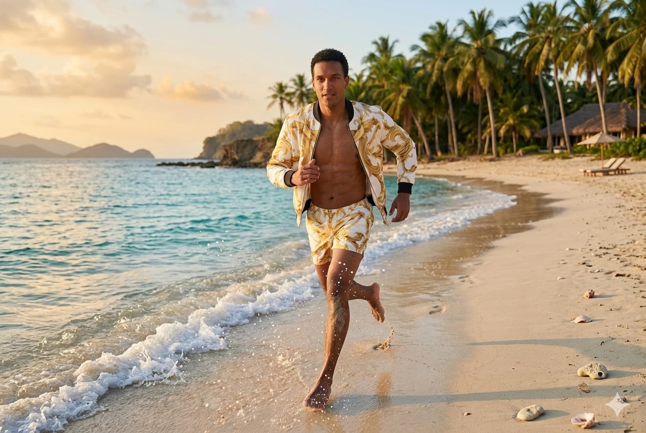 A series of male models walk down a sleek, modern runway under soft, warm lighting. The background features a clean, white catwalk with subtle, elegant masculine decorations. Each model wears one of the clothing line's outfits, showcasing the designs from various angles. The camera captures the models in steady, medium shots, highlighting their movements and the clothing's details. The overall visual style is sophisticated and polished, emphasizing the elegance and versatility of the clothing line.