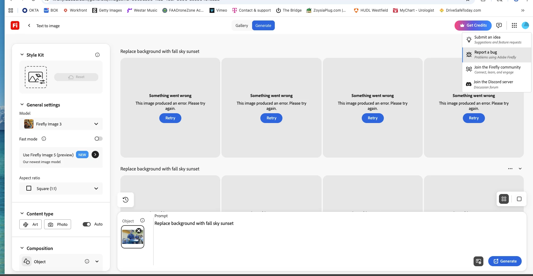 Trying to replace the background or generate a cartoon image from a photo I uploaded and when I hit "generate," I receive and error message telling me to try again.