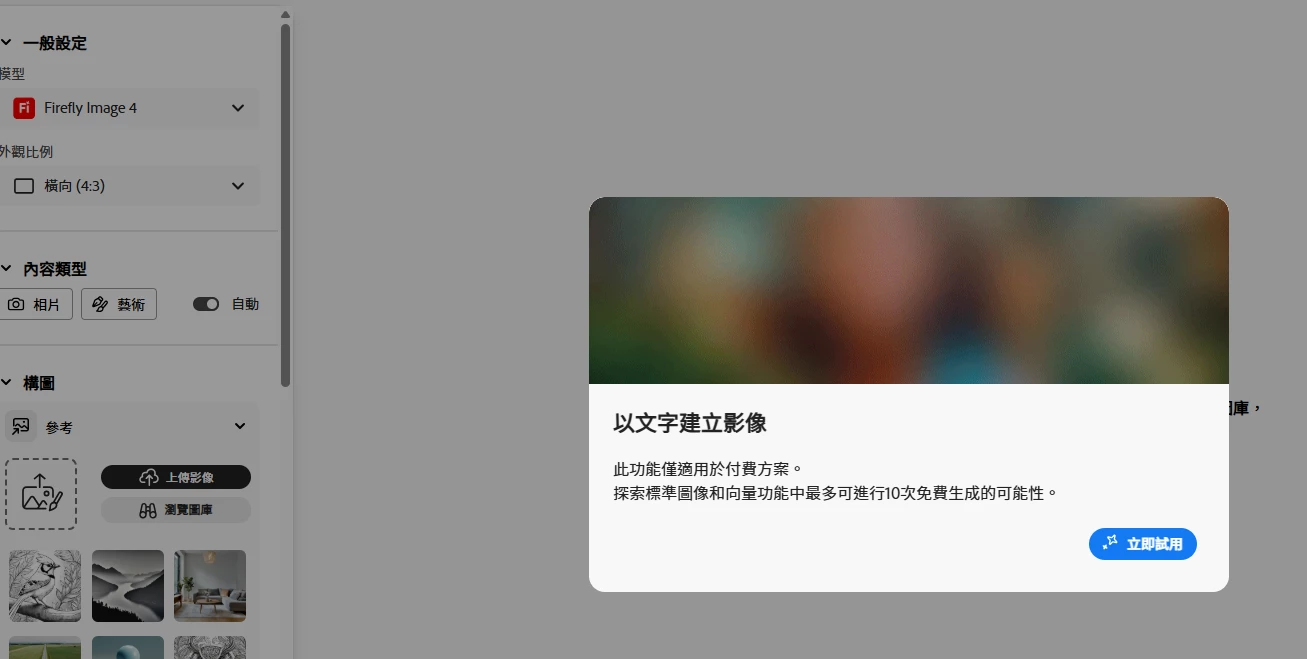 In addition, when I attempt to use the "Text to Image" feature, it automatically uses the "Image 4" model and prompts me to start a trial, stating that I only have 10 generation attempts available.