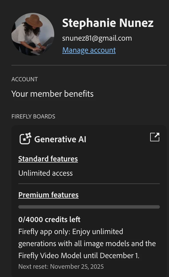 Adobe Firefly boards desktop online. I'm unclear as to whether or not I have credits. When I try to generate, it says I need to buy more, but my account benefits say unlimited. Can you clarify?