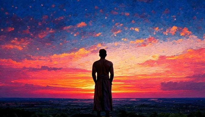 A oil painting of horizon sky with a pinkish dark filled with star oill painting, a guy observing the sky