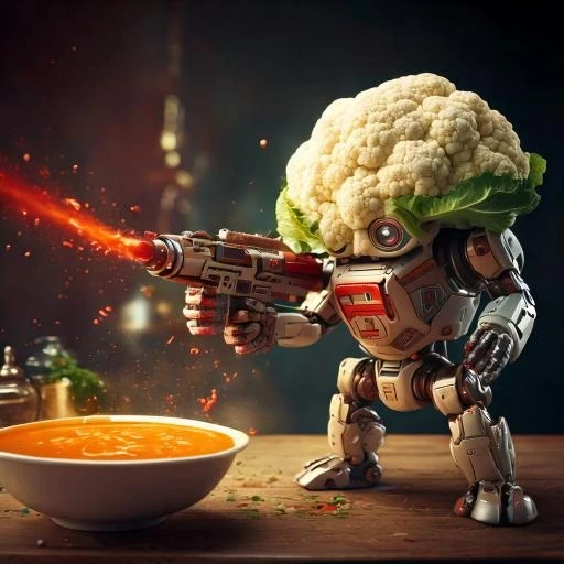 una coliflor super héroe robot con una ametralladora que lanza salsa de tomate luchando contra una sopa instantanea