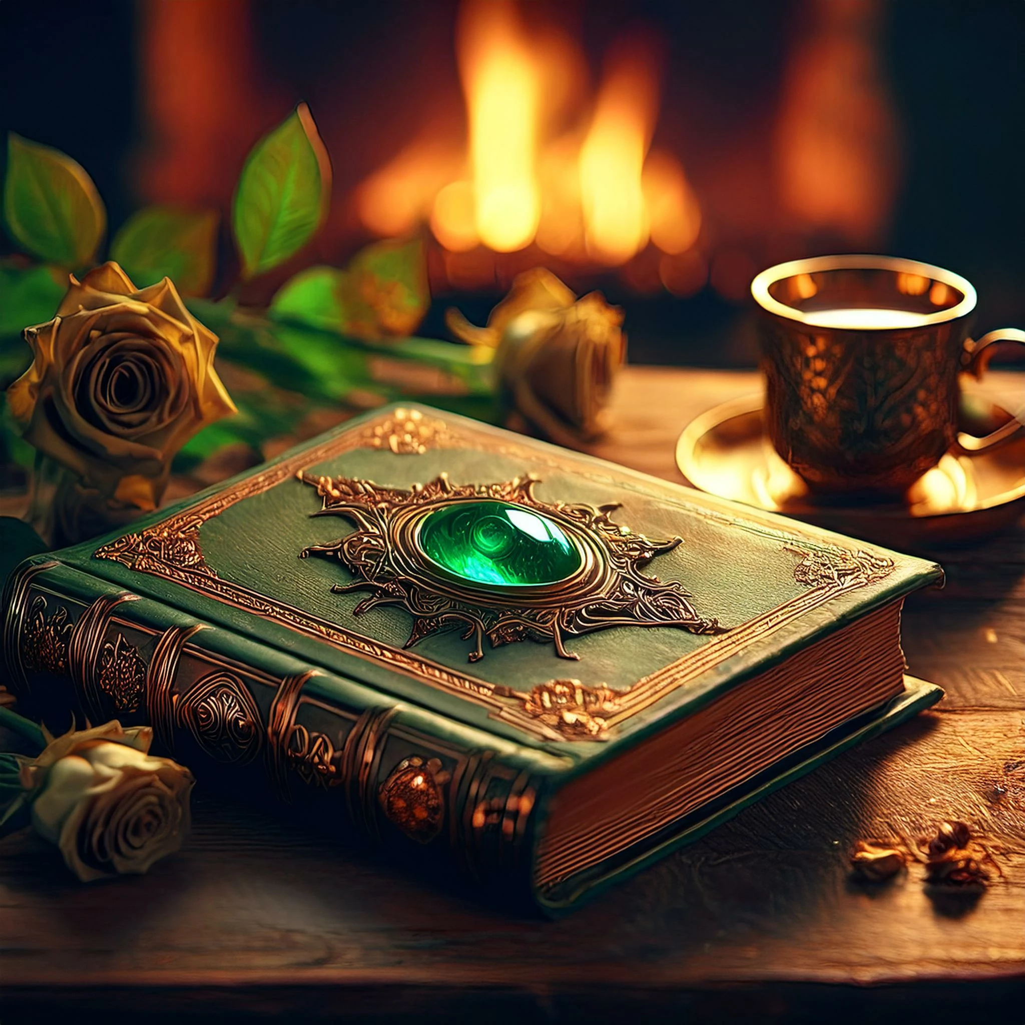 a vintage setting where a book is kept on a wooden table, close up shot of the book, book cover is leather and old with ancient markings, with an eye shaped design made of green emerald gem glowing mysteriously, fireplace in the background, vintage ambient, blurry coffee mug kept on table in the background, with some wilted roses kept near the book