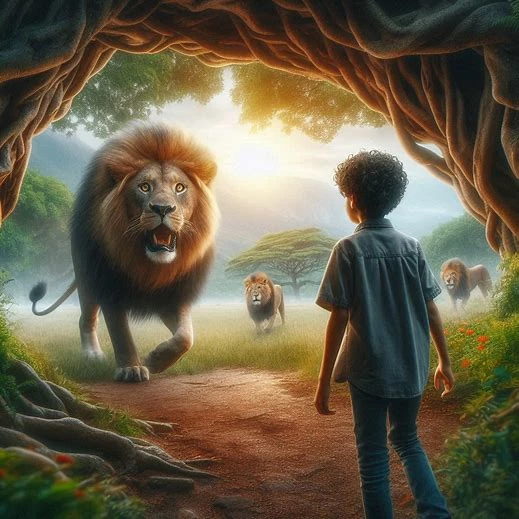 3d cartoon images loan and one boy to ateek loan and background is Jugal