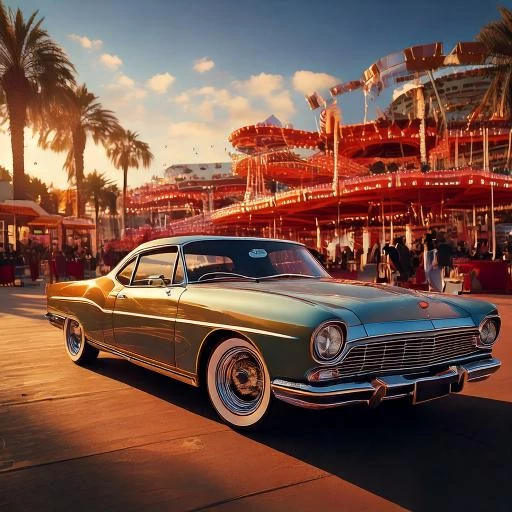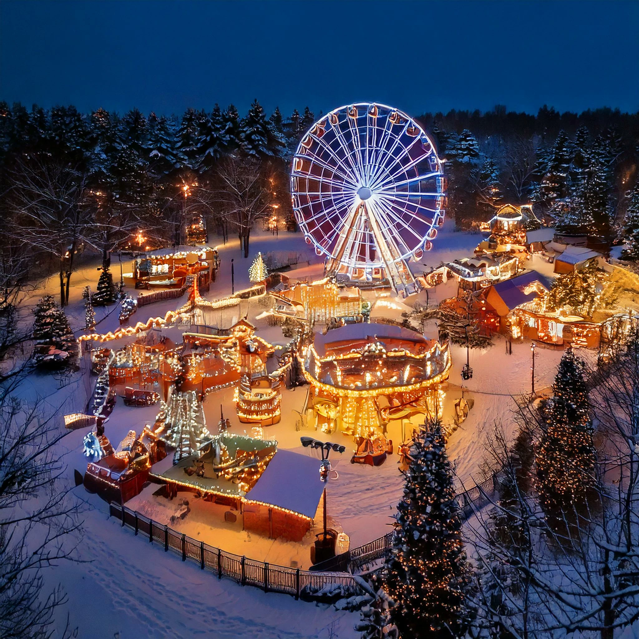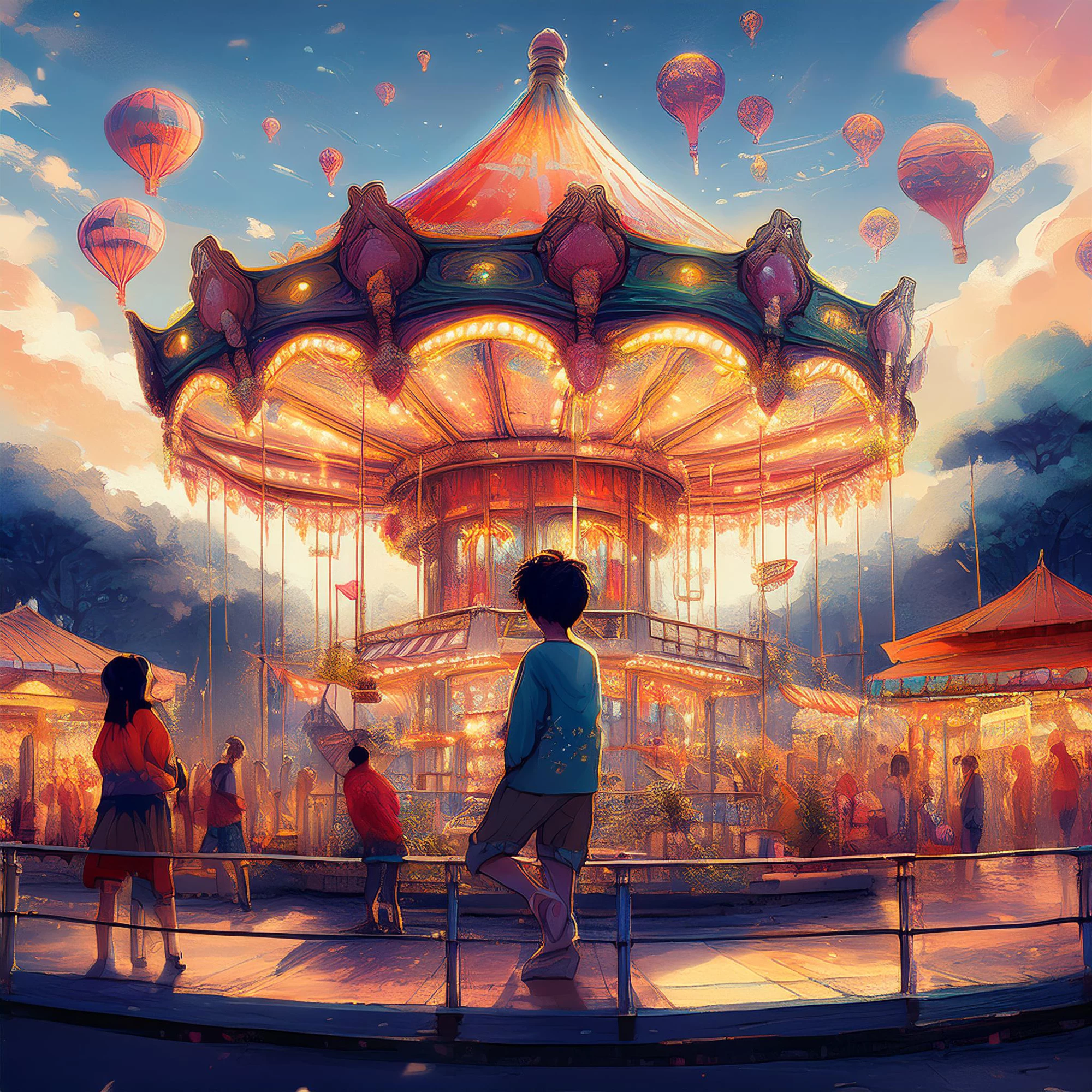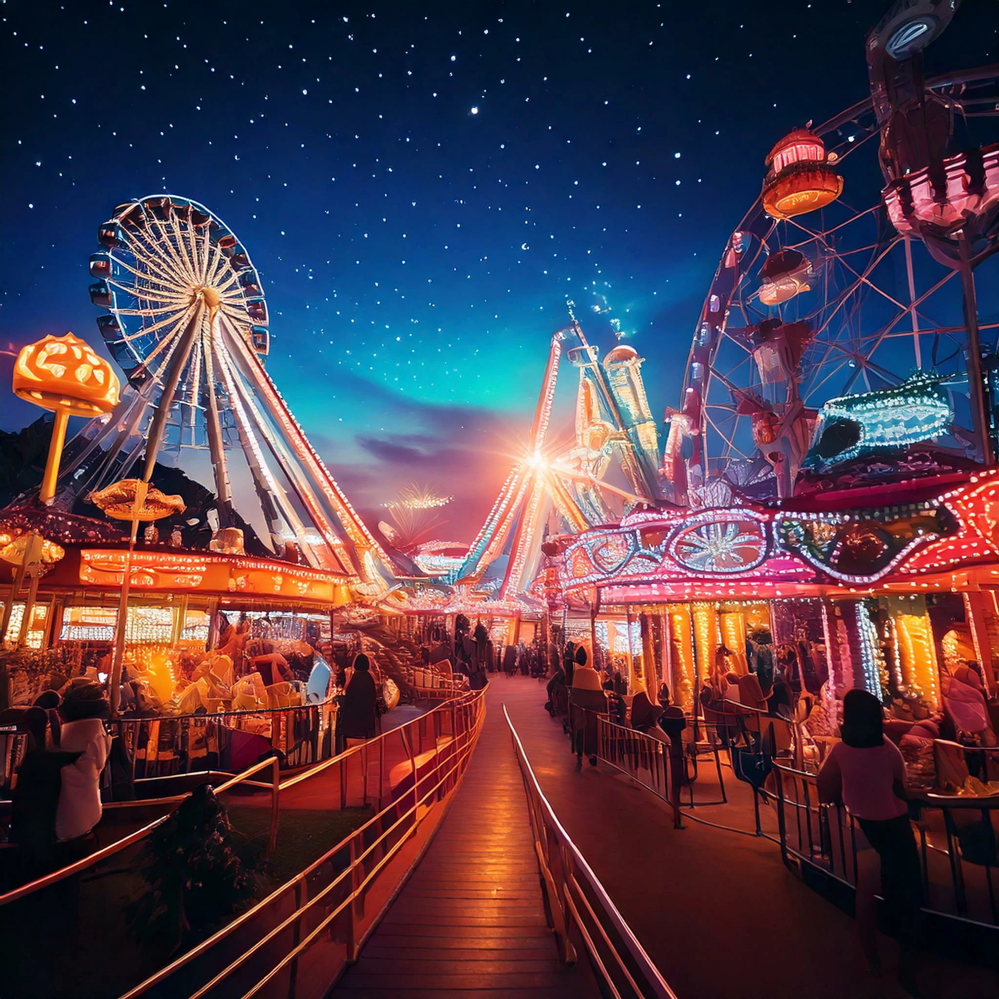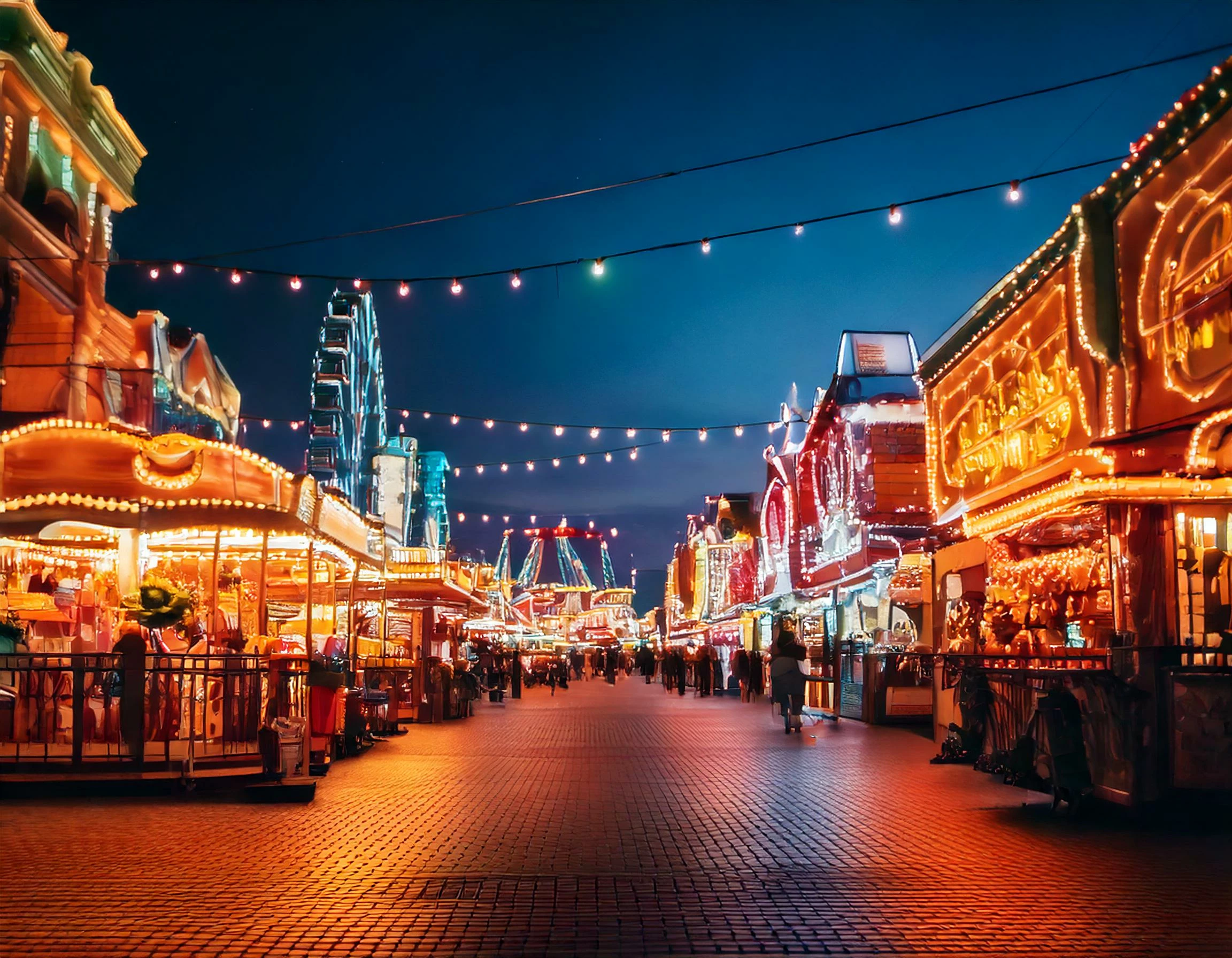 The Prompt I used: An evening view of a bustling street in an adventure park, featuring illuminated rides and colorful gaming booths. The background is blurred, highlighting the vibrant attractions and lively atmosphere