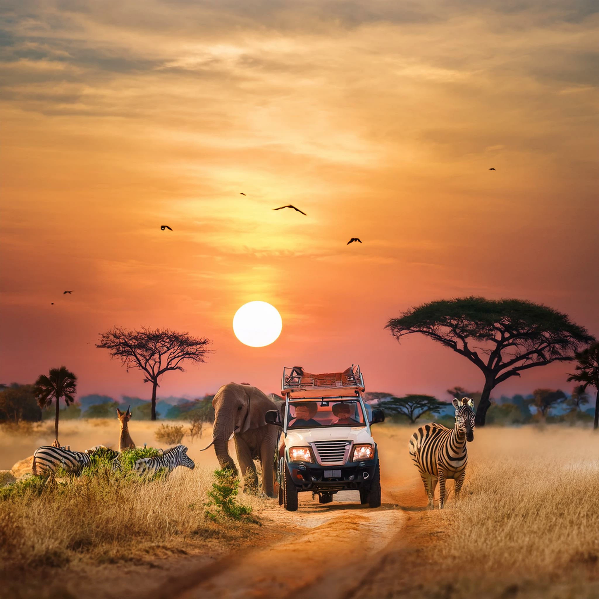 Prompt: Jeep tour at sunset, on a wildlife reserve with peaceful elephants, gazelle, zebras. Silhouettes of giraffes and baobab trees in the background.