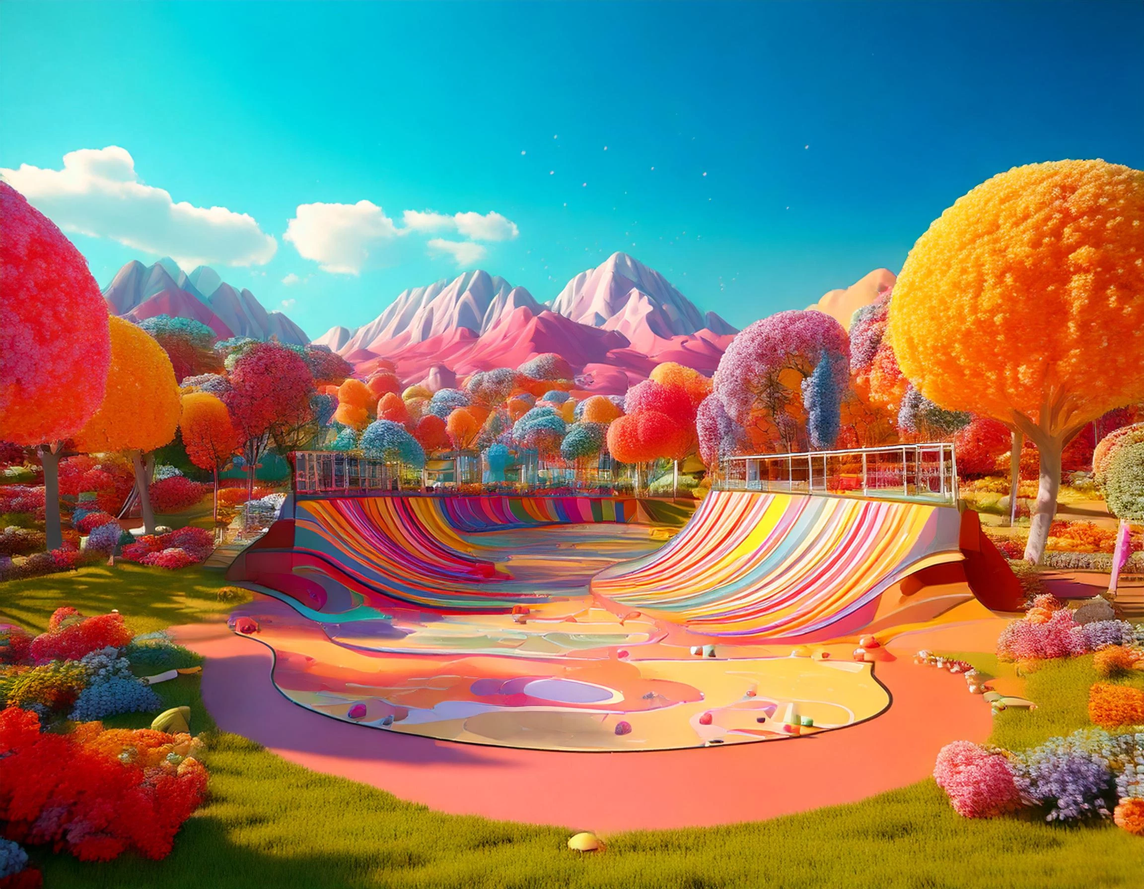 Prompt (with a Dr. Seuss image reference): skatepark in a surreal landscape with candy mountains, gumdrop bushes and lollipop trees